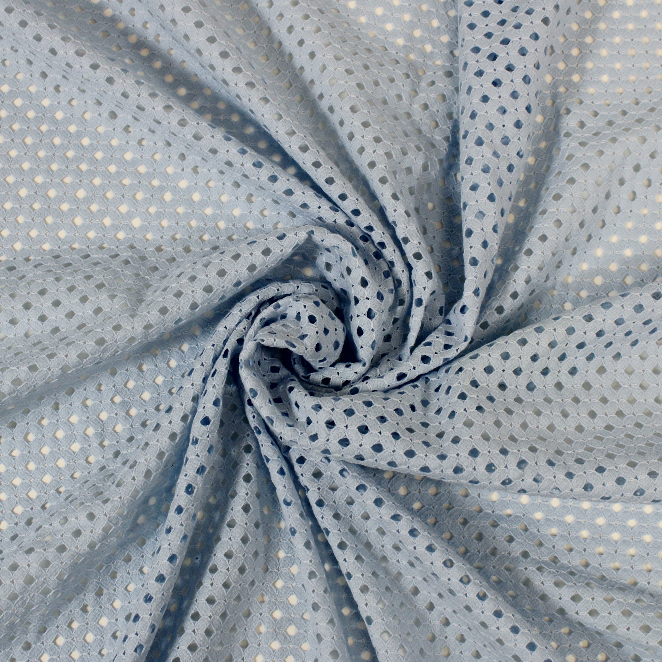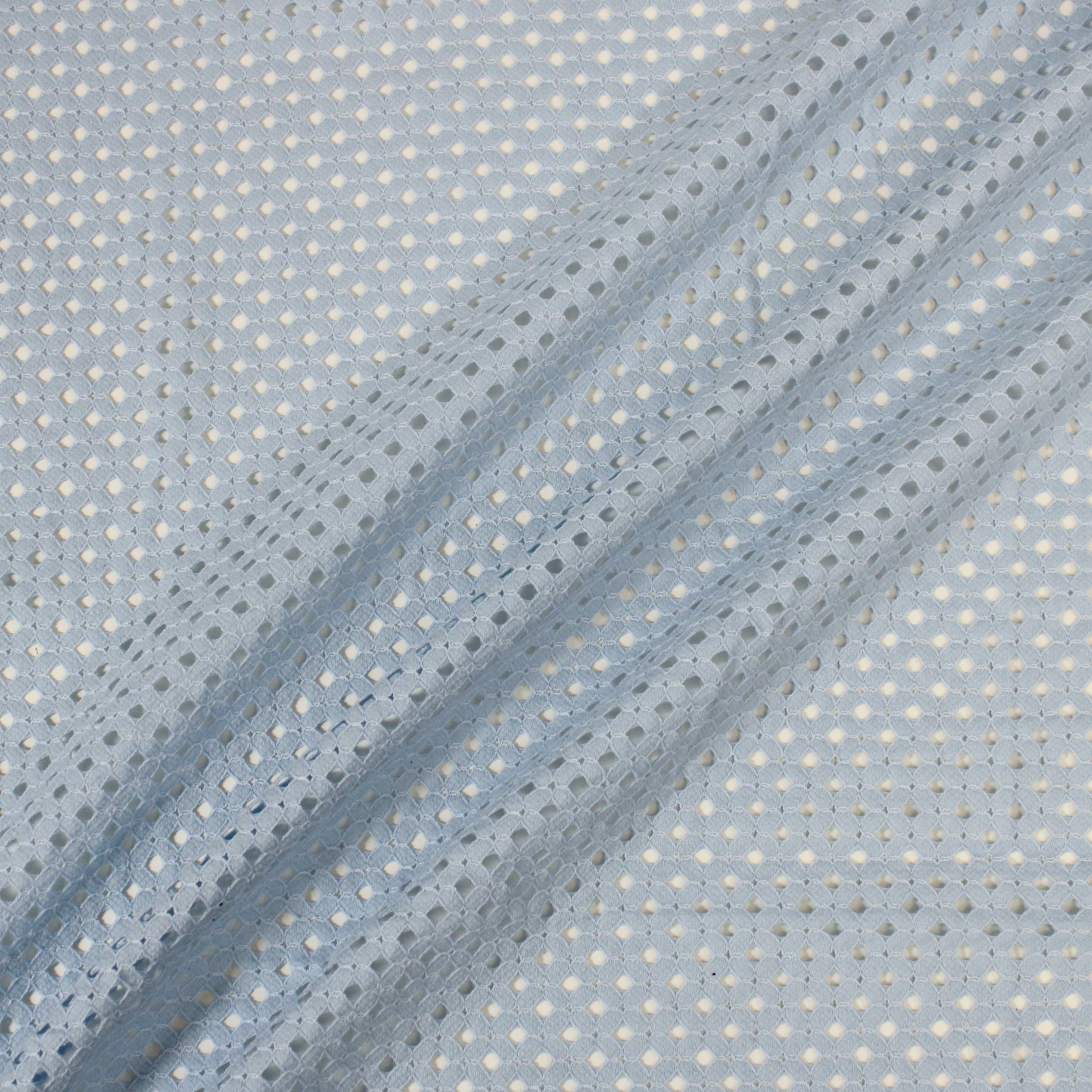Breezy lace fabric in baby blue geometric pattern. Labeled as 56% nylon and 44% cotton content. Measures 55” in useable width and available for order by the yard.
