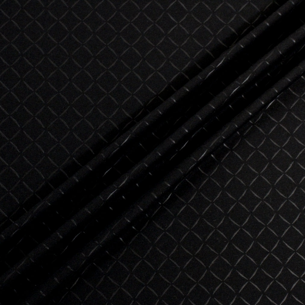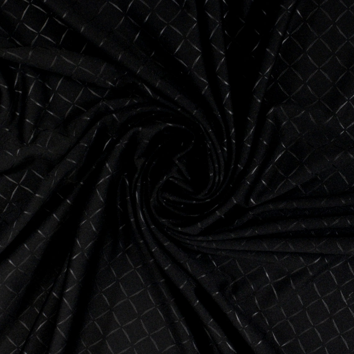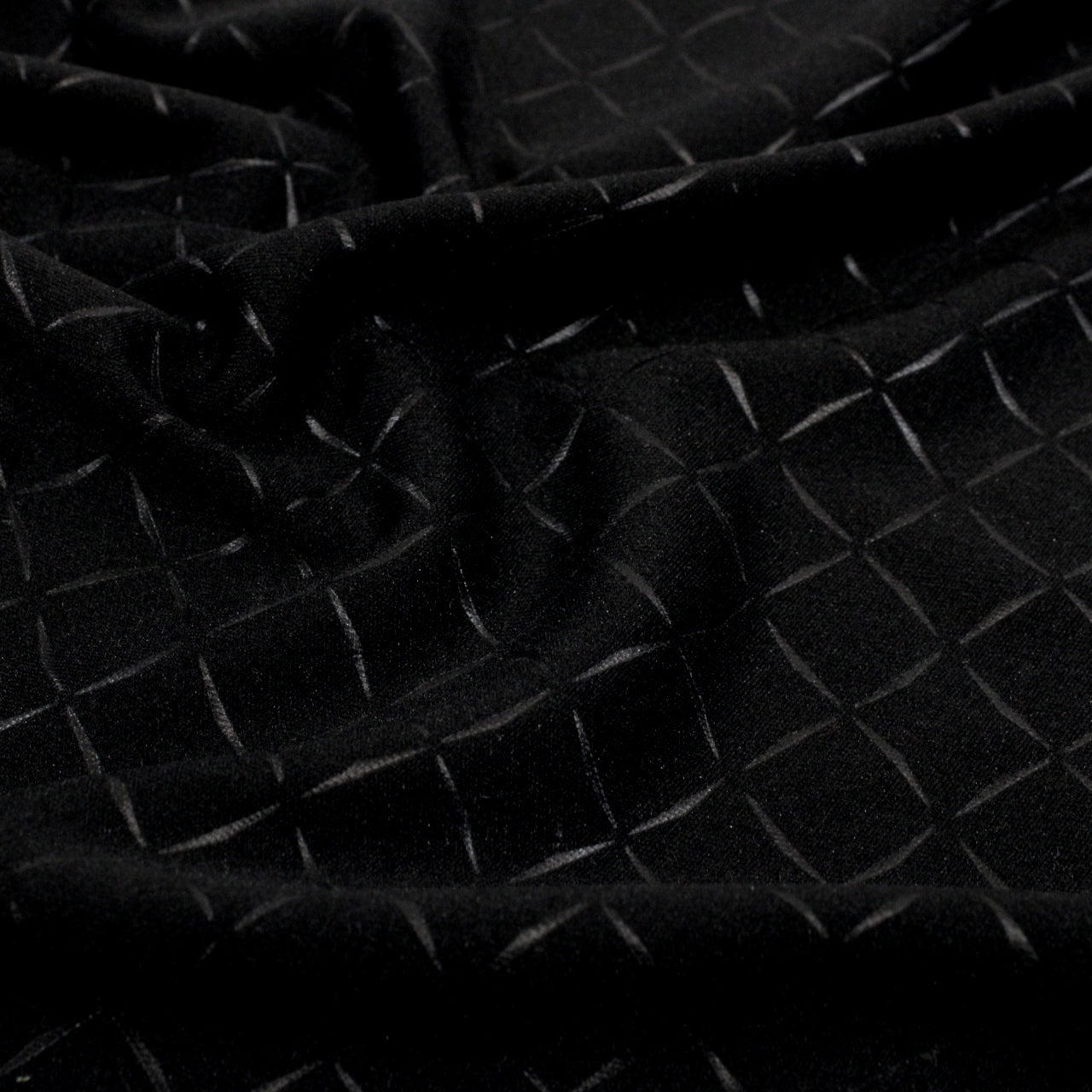 Interlock knit in black with black diamond print. Burn tested synthetic content, likely polyester. Measures 61" wide and available for order by the yard.