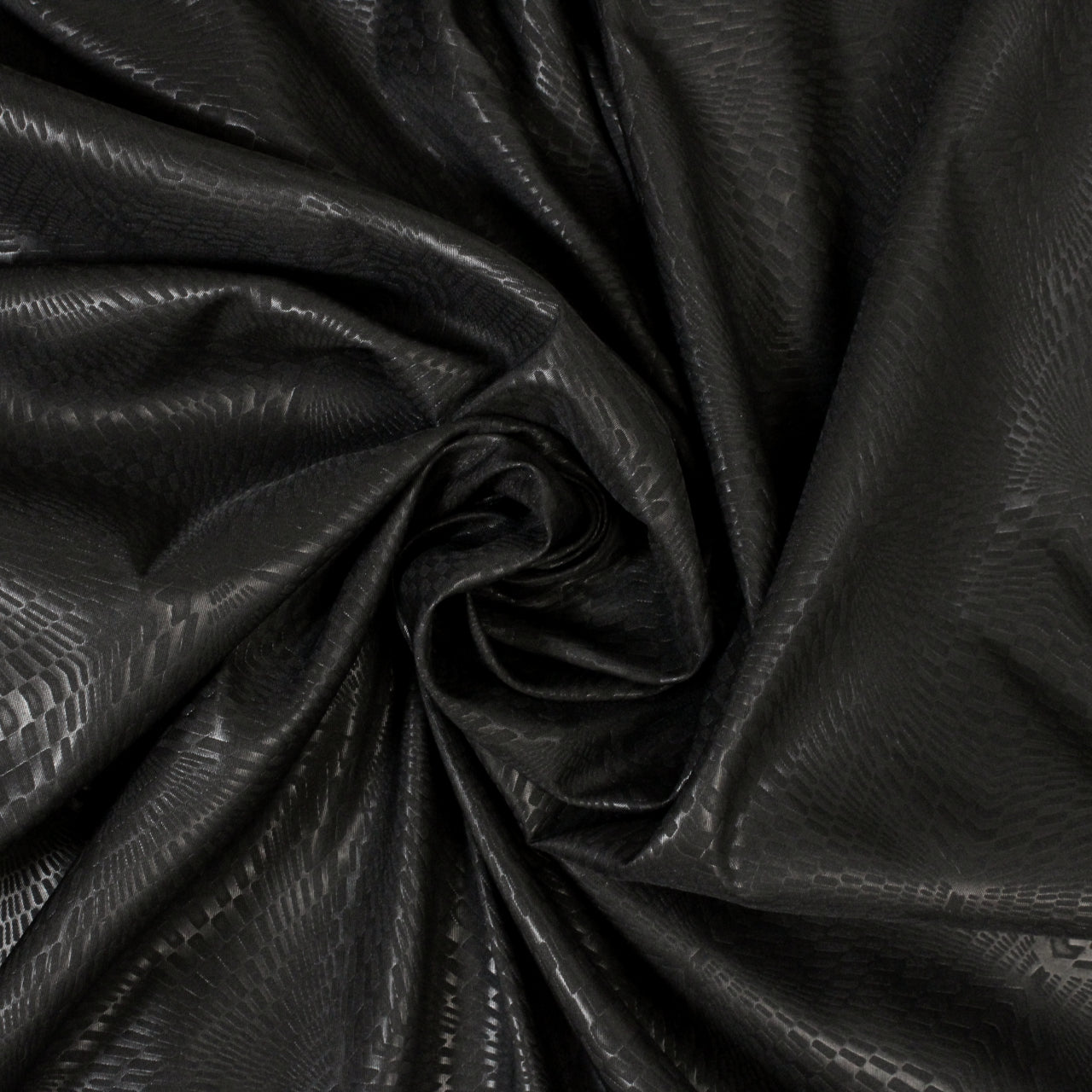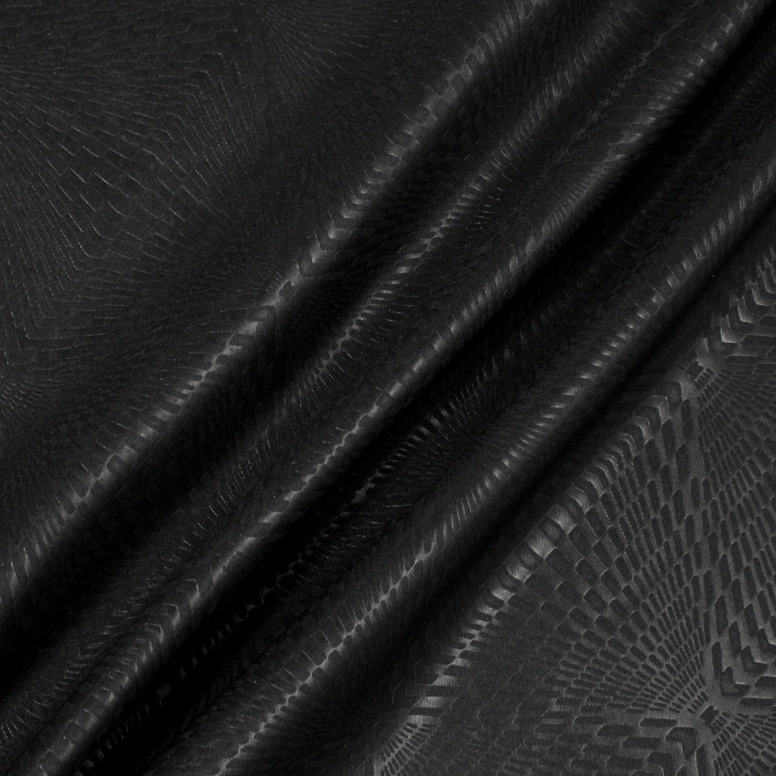 Black woven fabric with black geometric print. Burn tested synthetic content, likely polyester. Measures 61" wide and available for order by the yard.