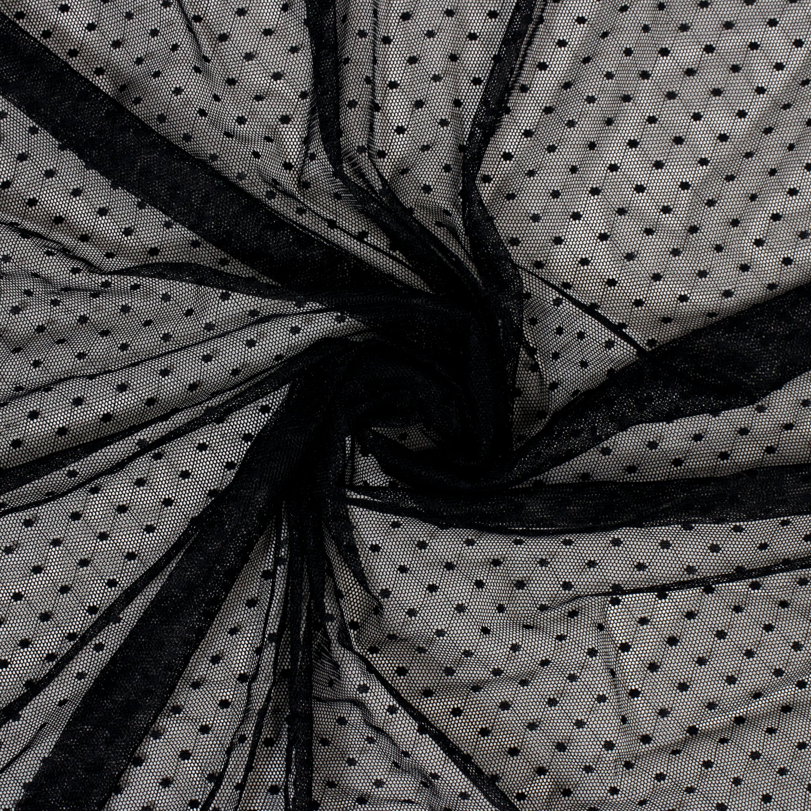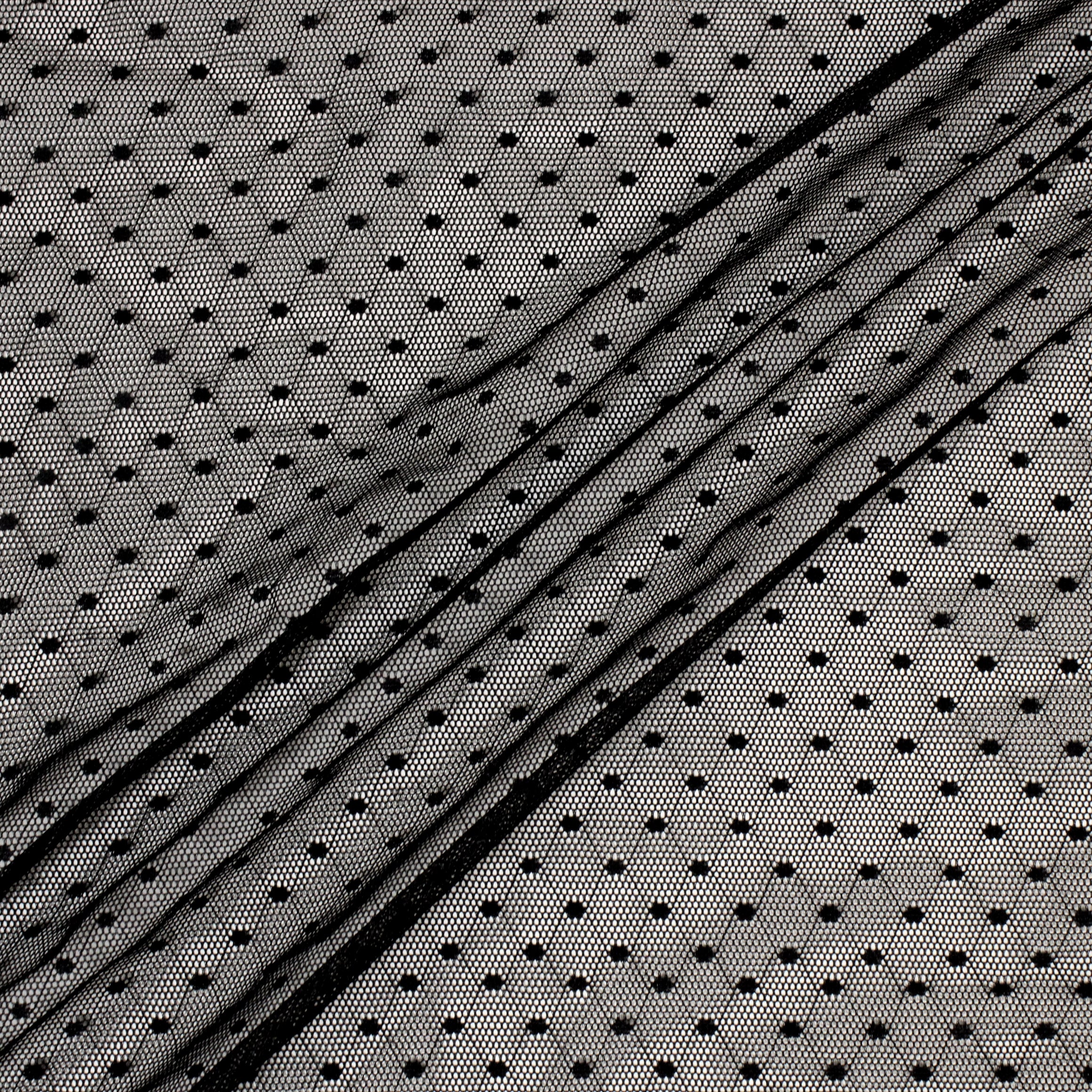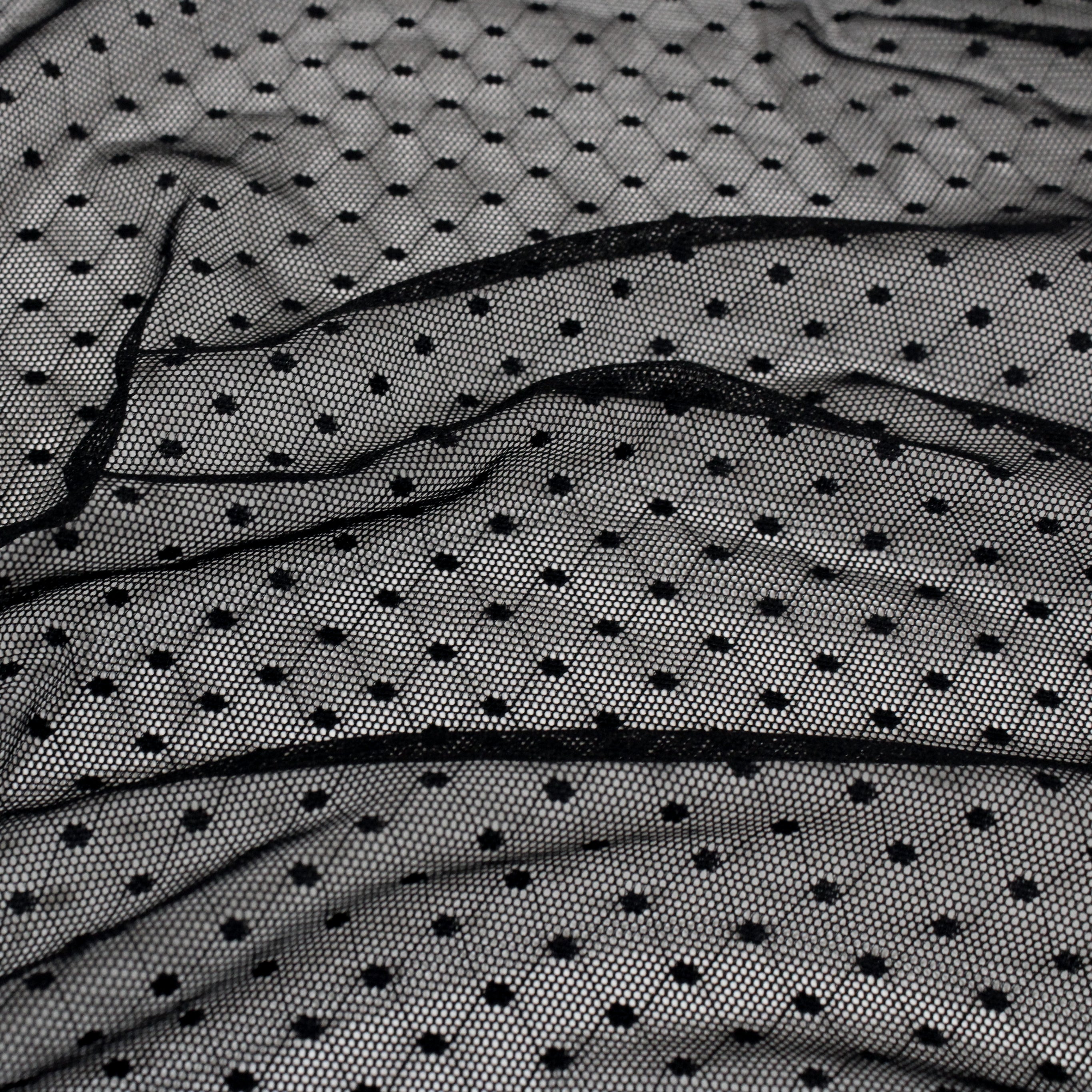 Black mesh with small polka dots. Burn tested synthetic content. Measures 60" in width and available for order by the yard.