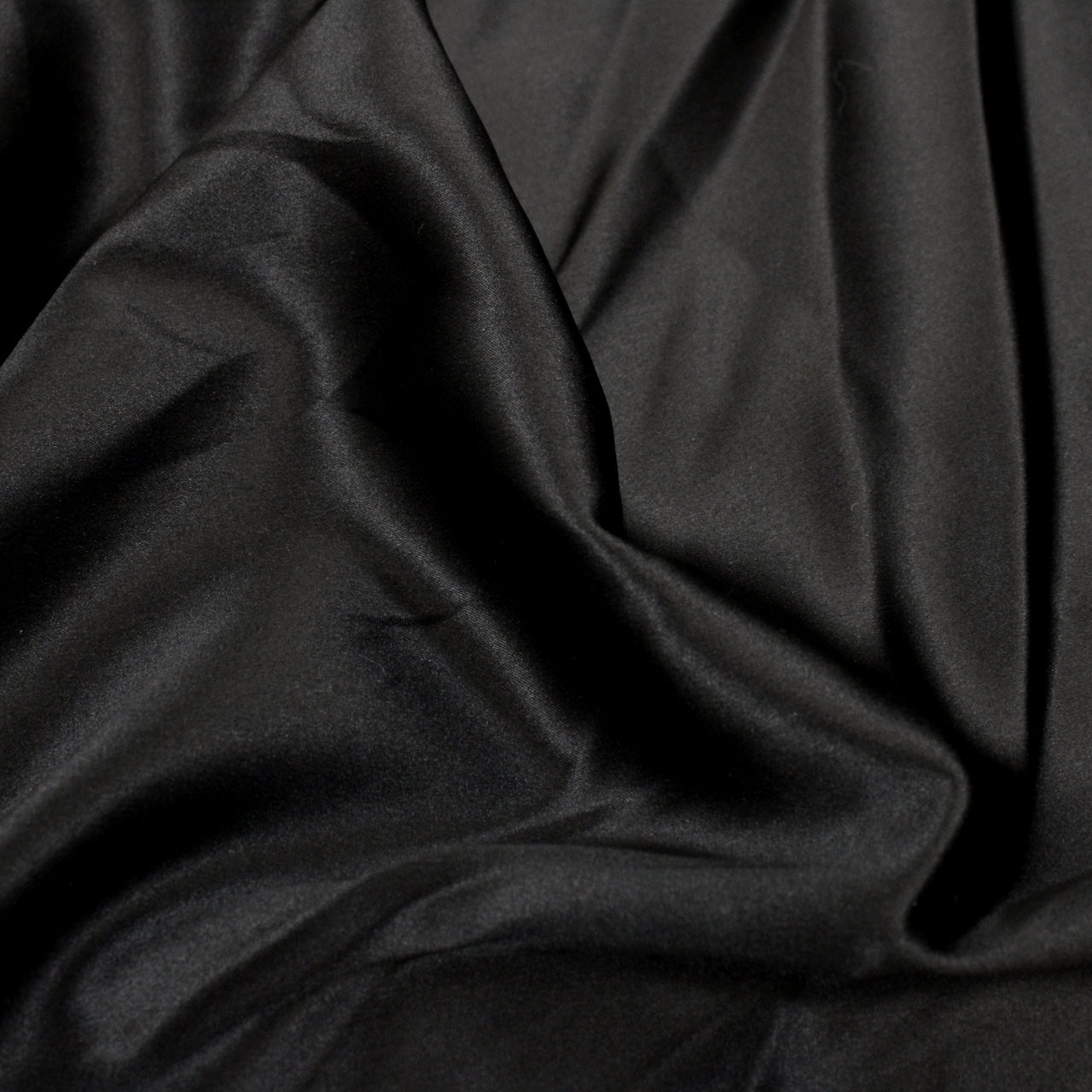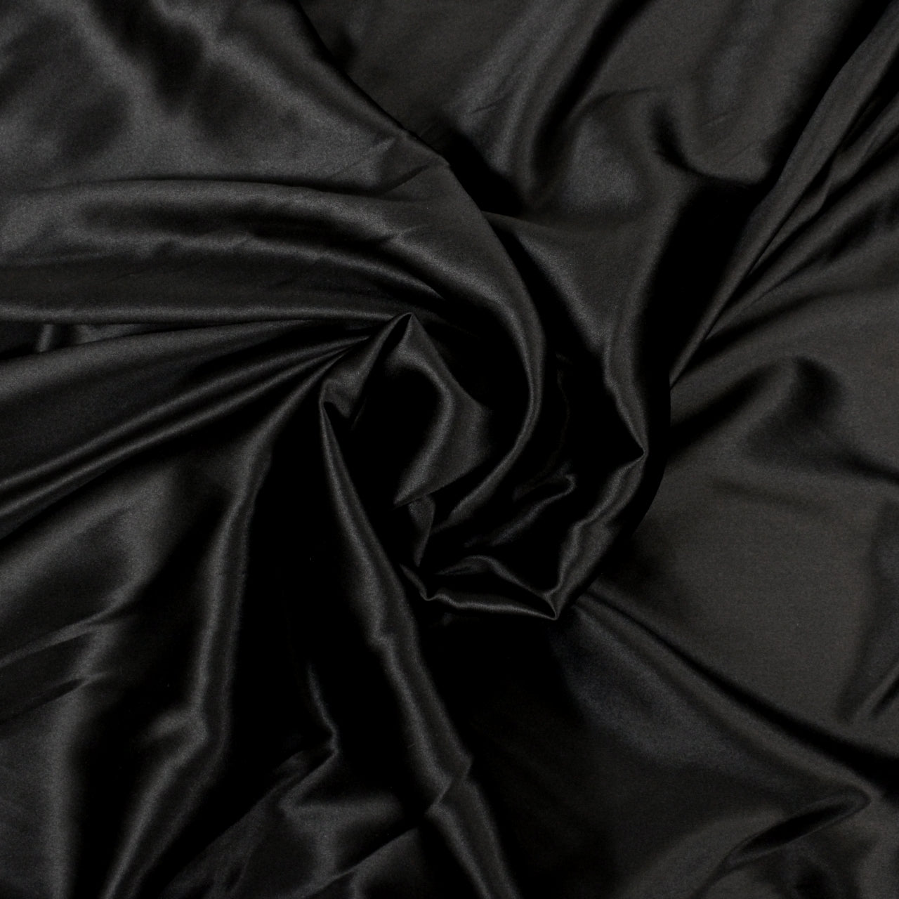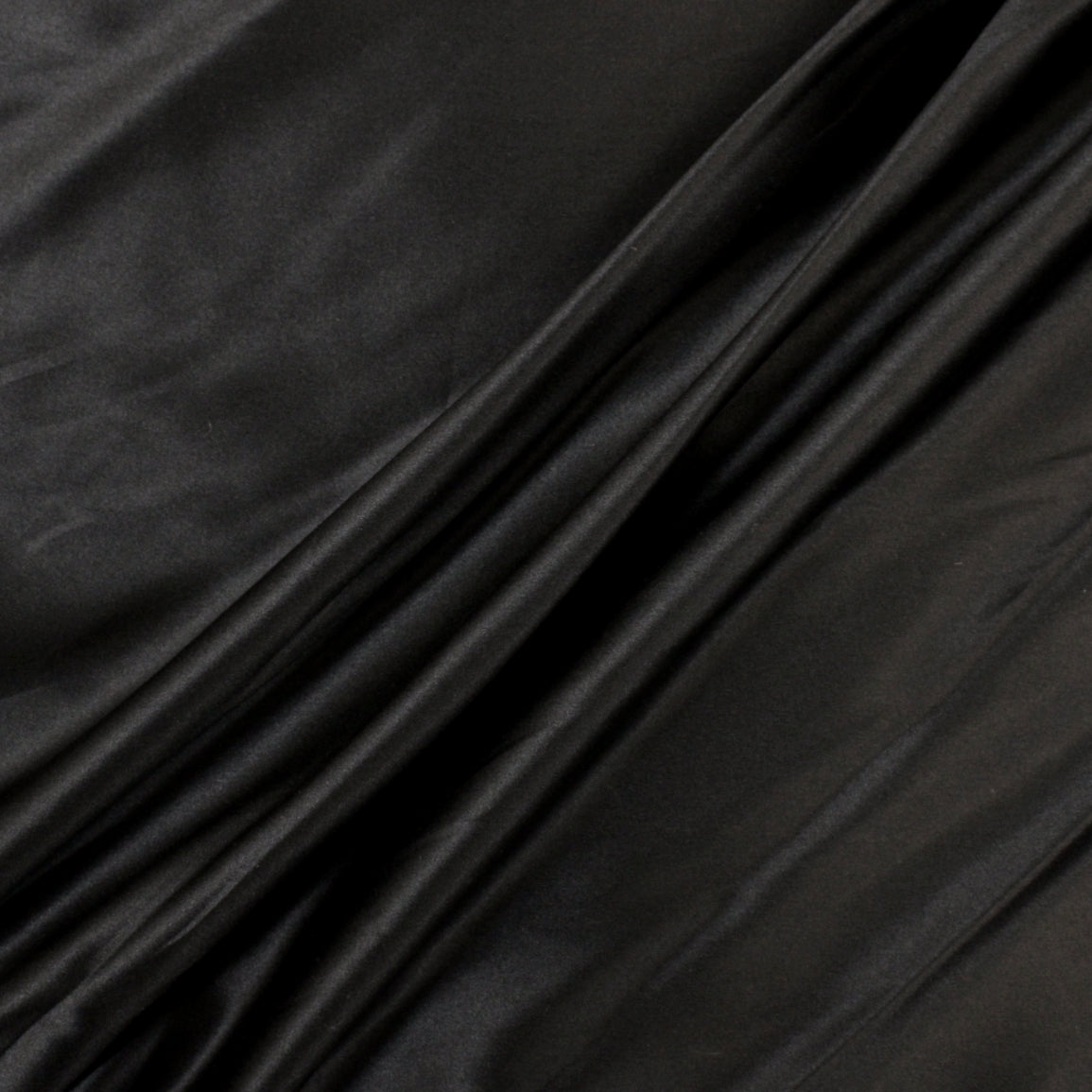 Stretch-silk charmeuse available in classic black. Burn tested silk content with a small percentage of synthetic content to add stretch, likely spandex. Measures 52" in width and is available for order by the yard.