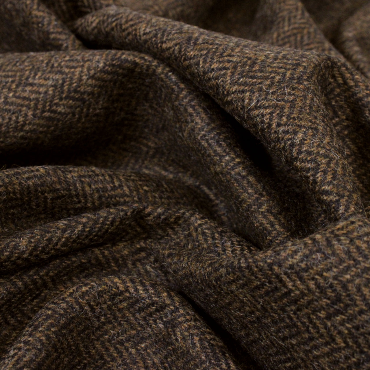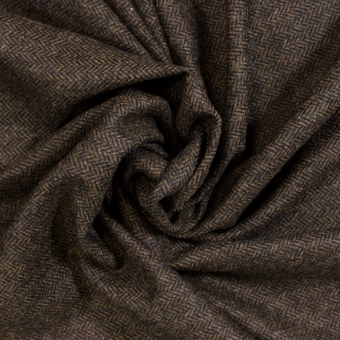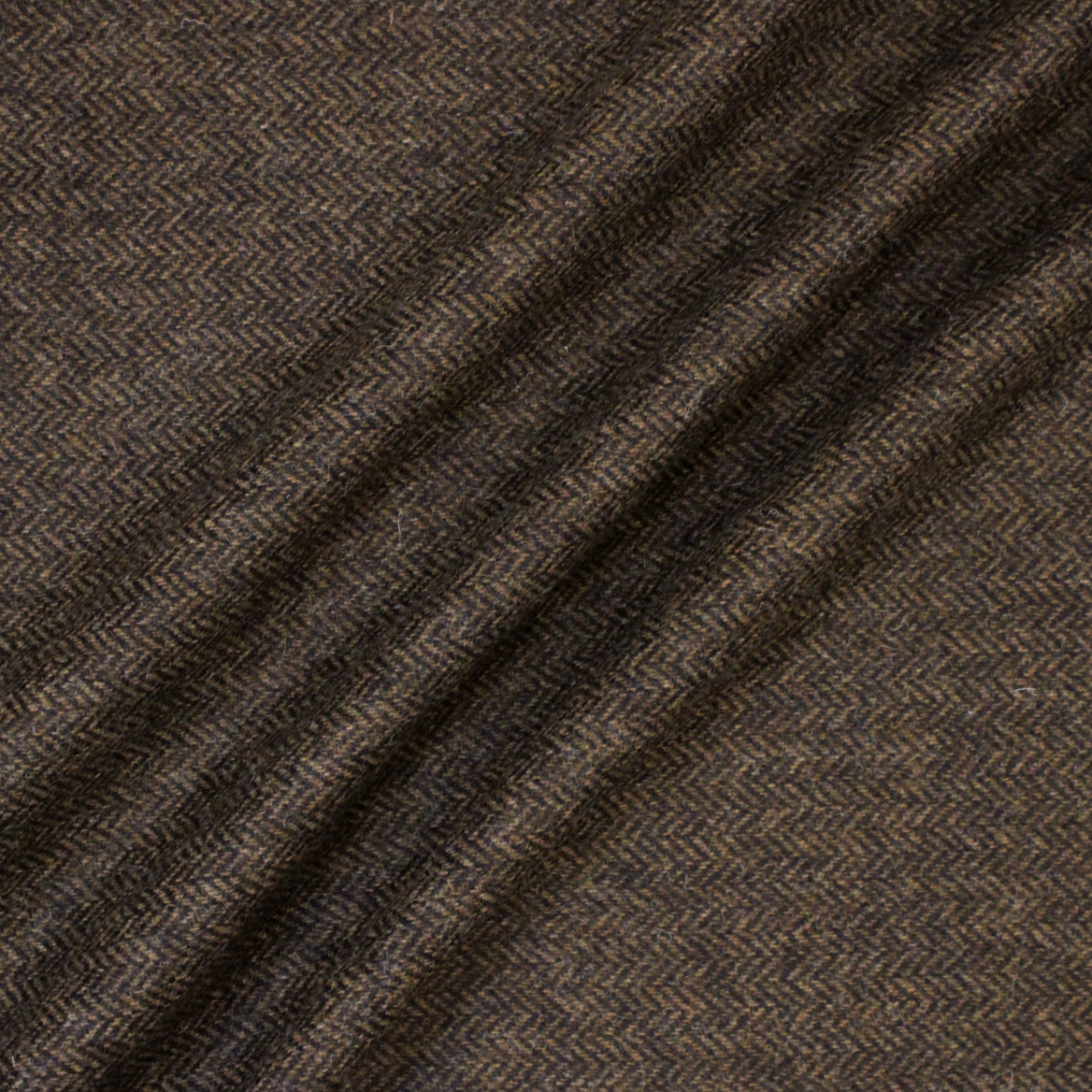 Herringbone patterned suiting of dark browns. Burn tested wool content. Measures 61" in width and available for order by the yard.