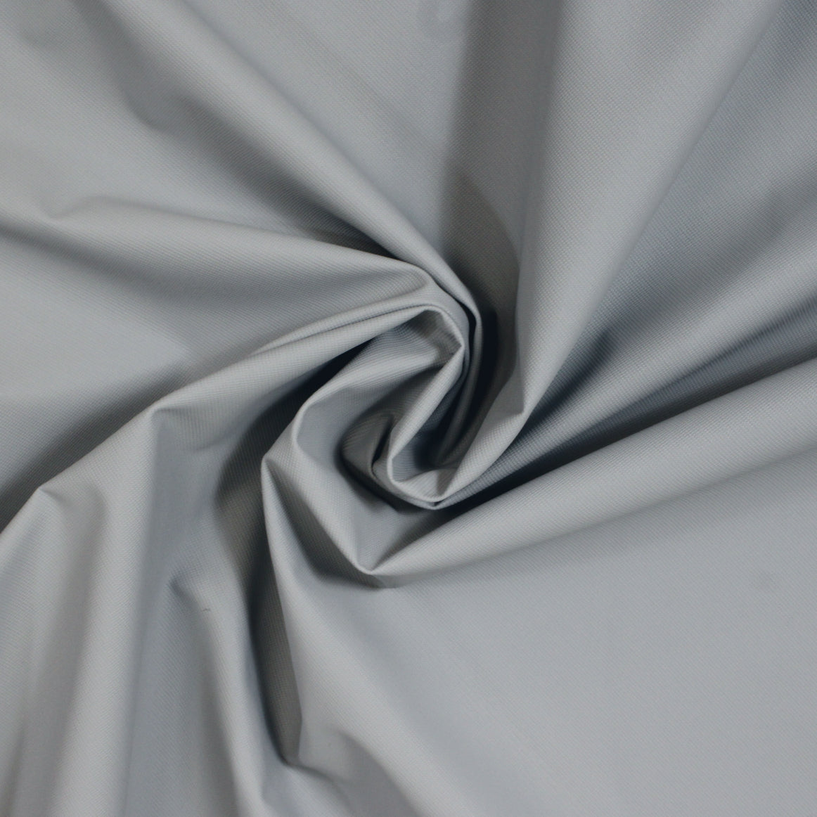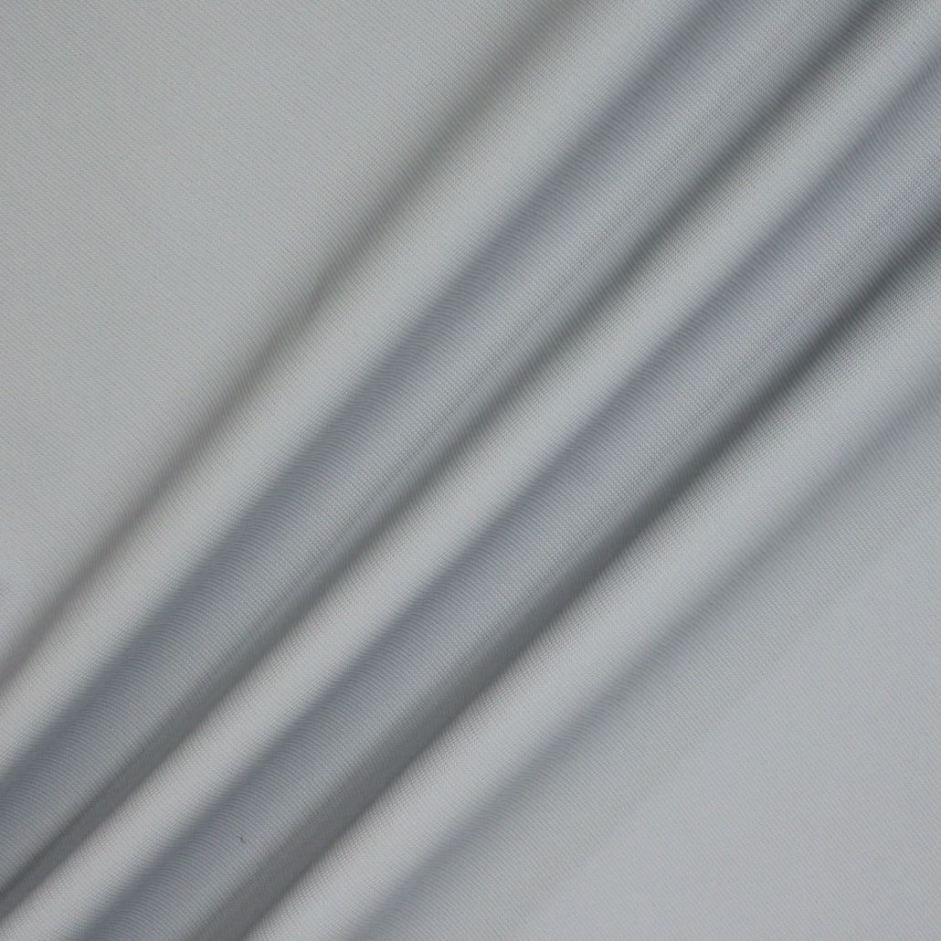 Vinyl in a very pale blue-grey, "glacier color," with embossed texture applied to resemble a twill weave. Labeled polyurethane coating. White synthetic knit backing is likely polyester content. Measures 55" in width and available for order by the yard.