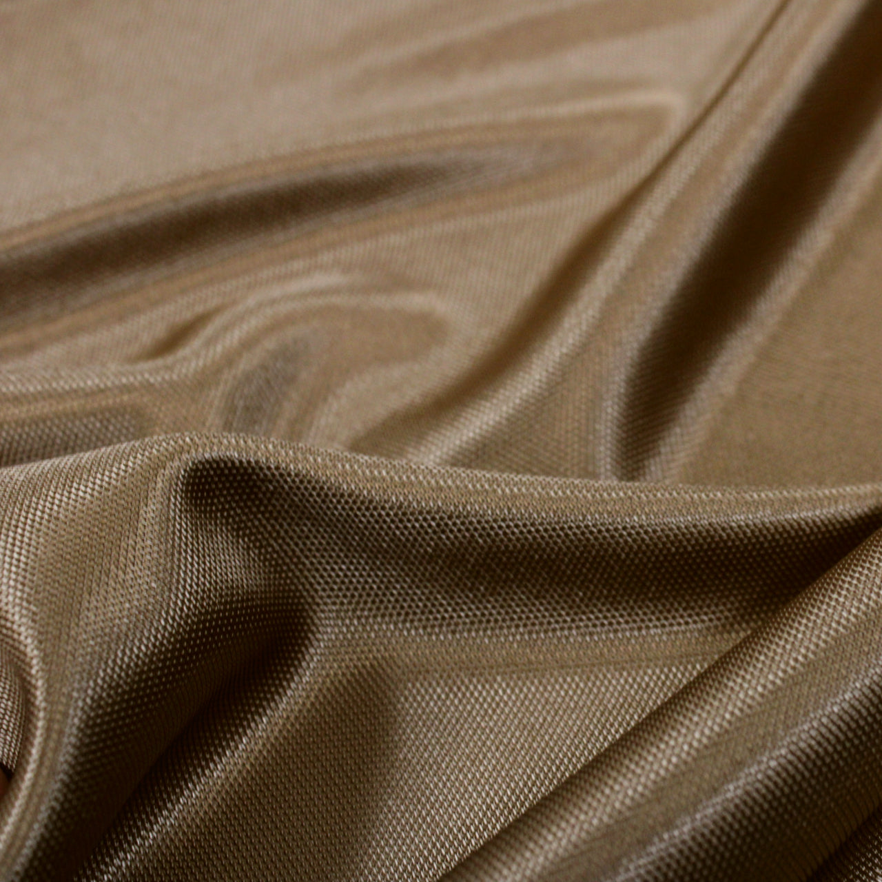 *This knit fabric is lightweight, slightly transparent, and stretches along the weft/crossgrain. Soft to the touch with a luminous shine and luxurious look and feel. Suitable for activewear apparel use. Due to the impeccable drape of this fabric, eveningwear applications could also be possible, but bear in mind it is a knit fabric.