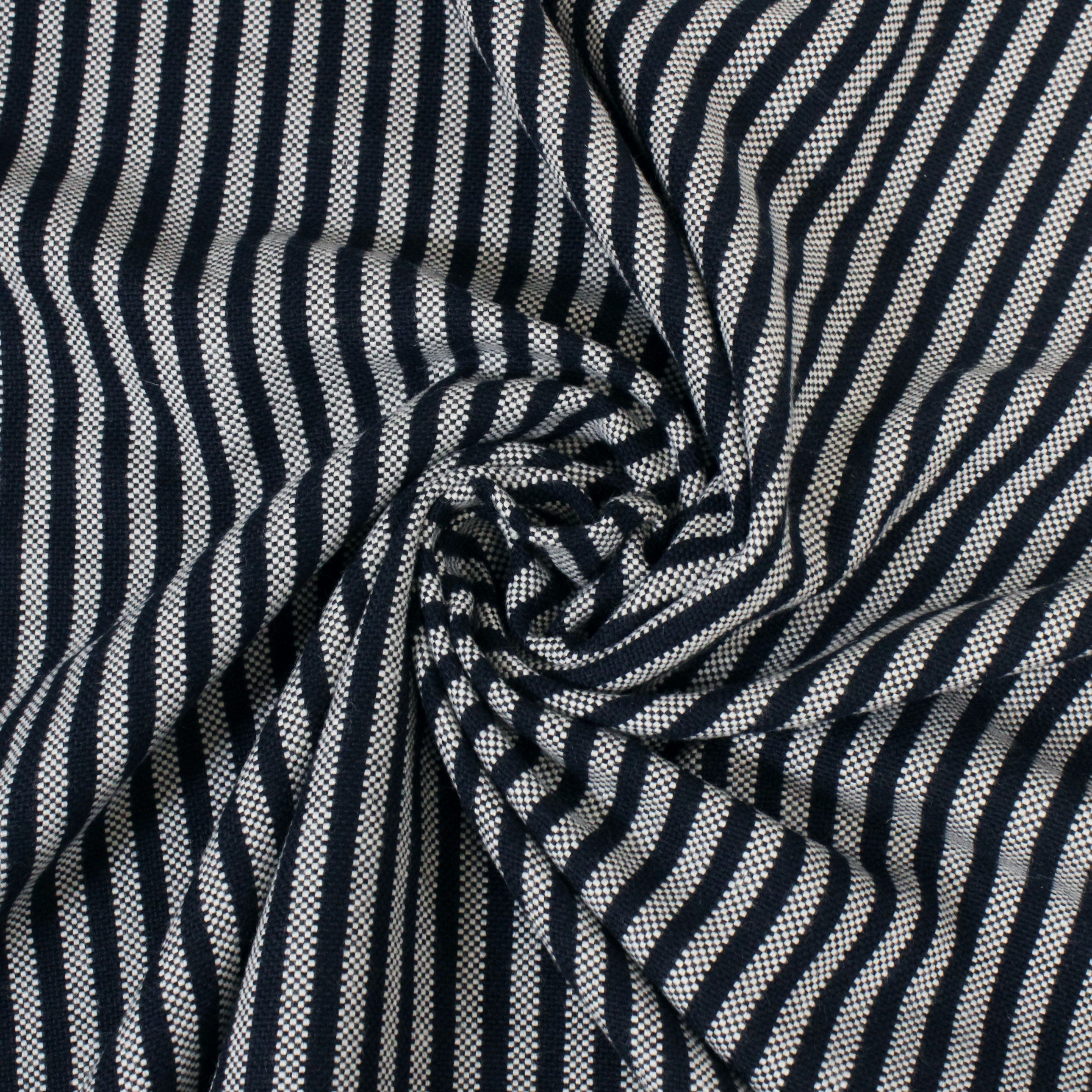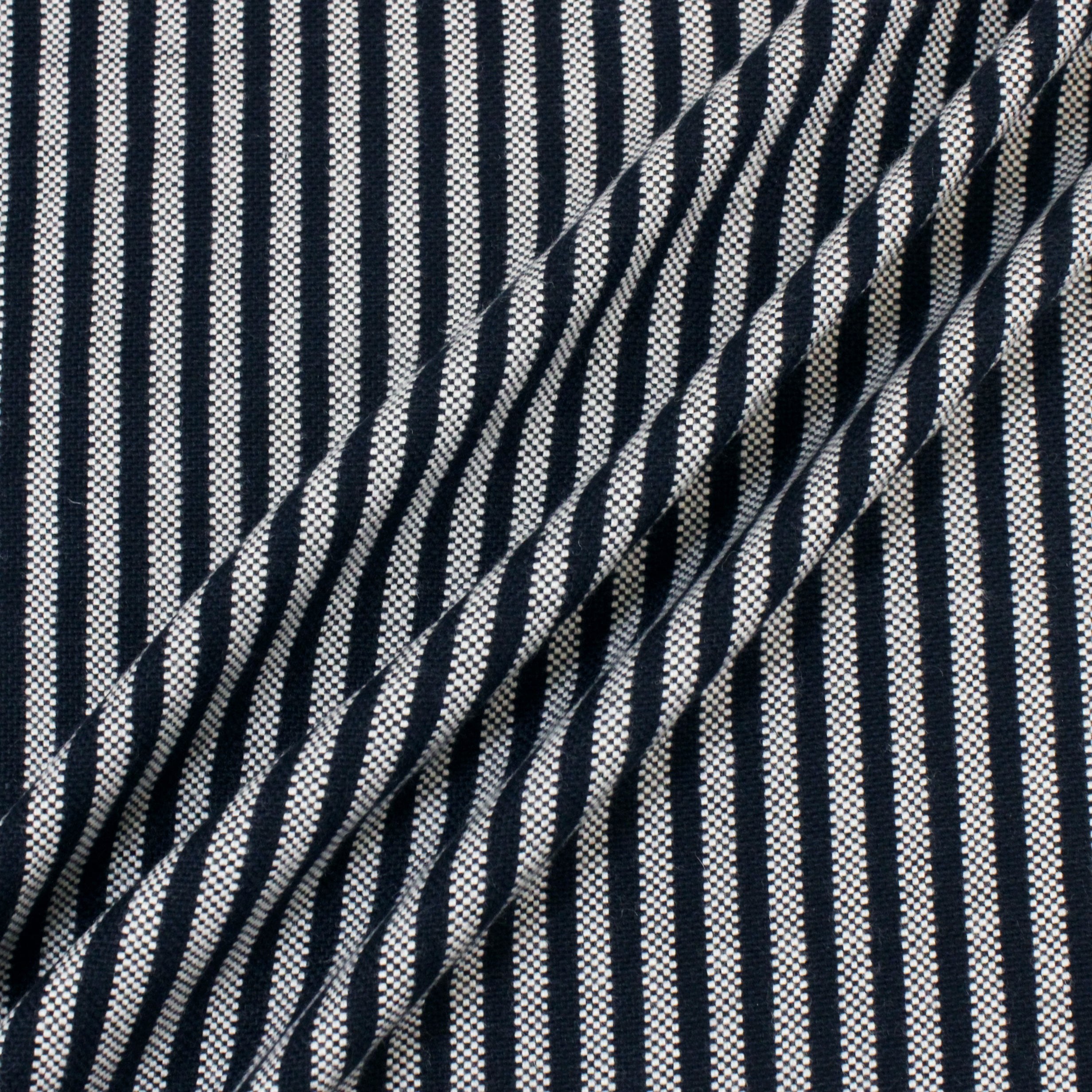 Blue and white stripe basket-woven suiting fabric. Burn tested as wool content. Measures 56" in width and available for order by the yard.