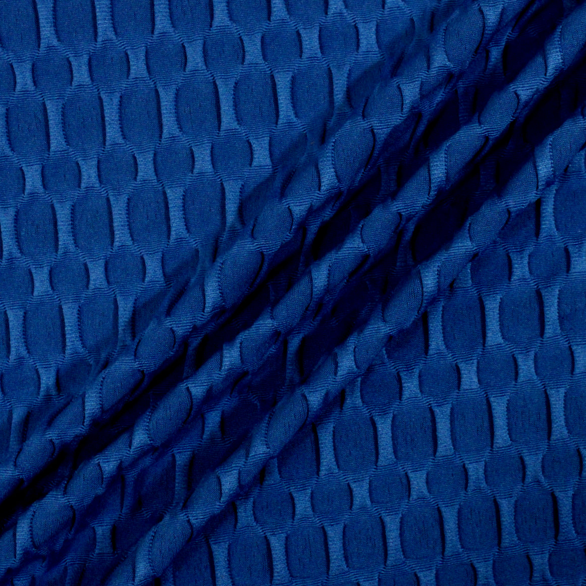Royal blue knit fabric with textural knit-in pattern throughout. Burn tested synthetic content. Measures 58.5" in width and available for order by the yard.