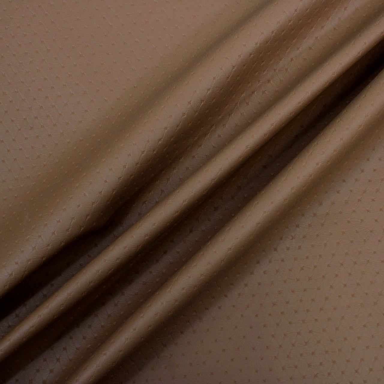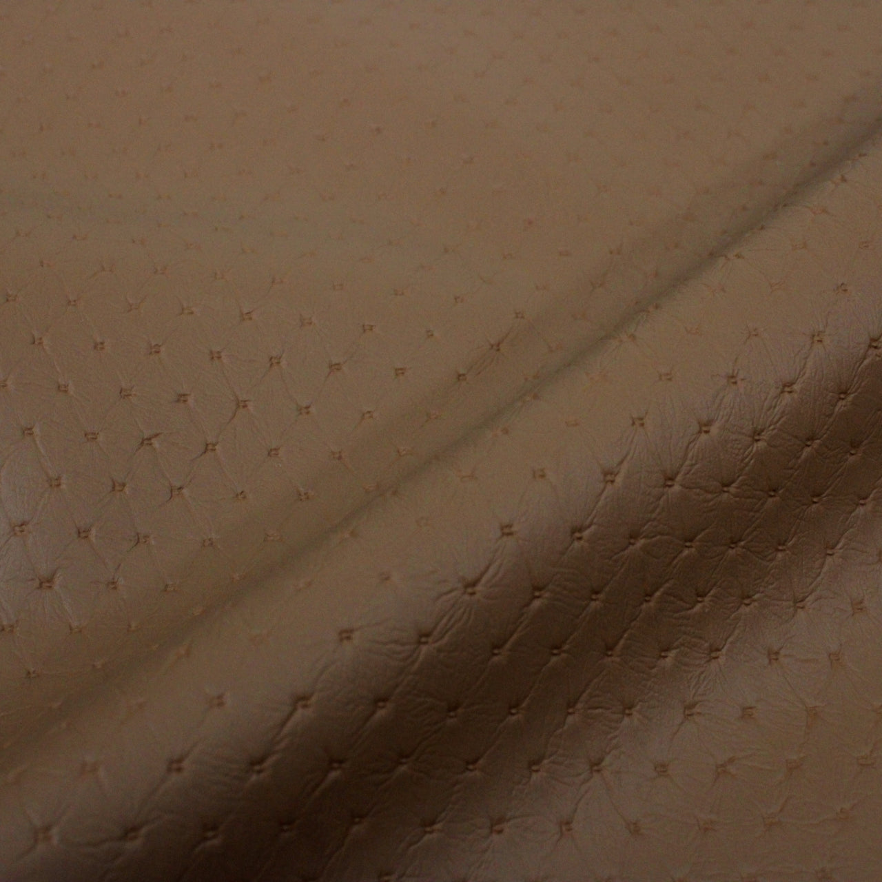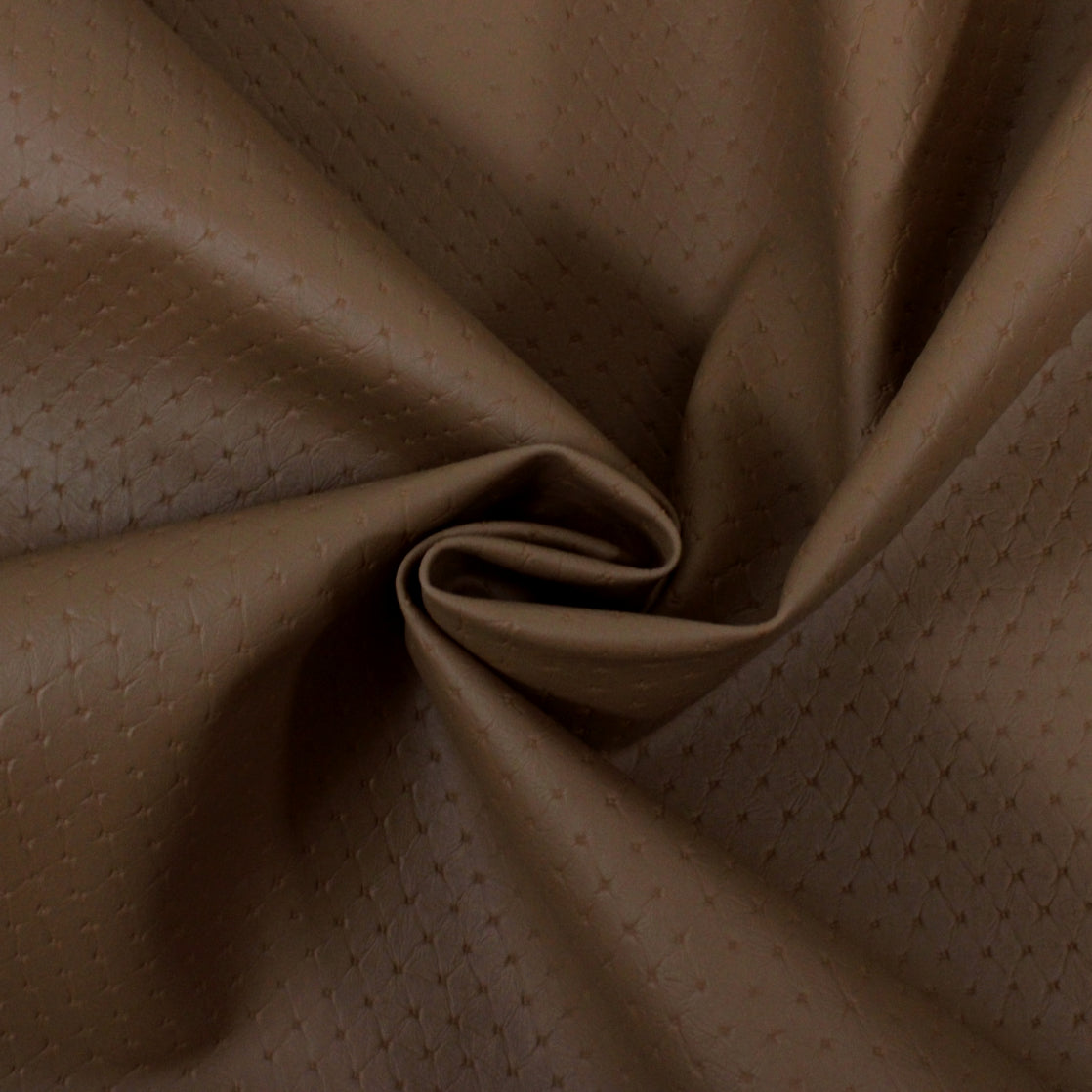 Faux leather "pleather" vinyl with embossed texture applied to resemble diamond quilting. White synthetic knit backing. Likely polyurethane coating on polyester knit content. Measures 56" in width and available for order by the yard.