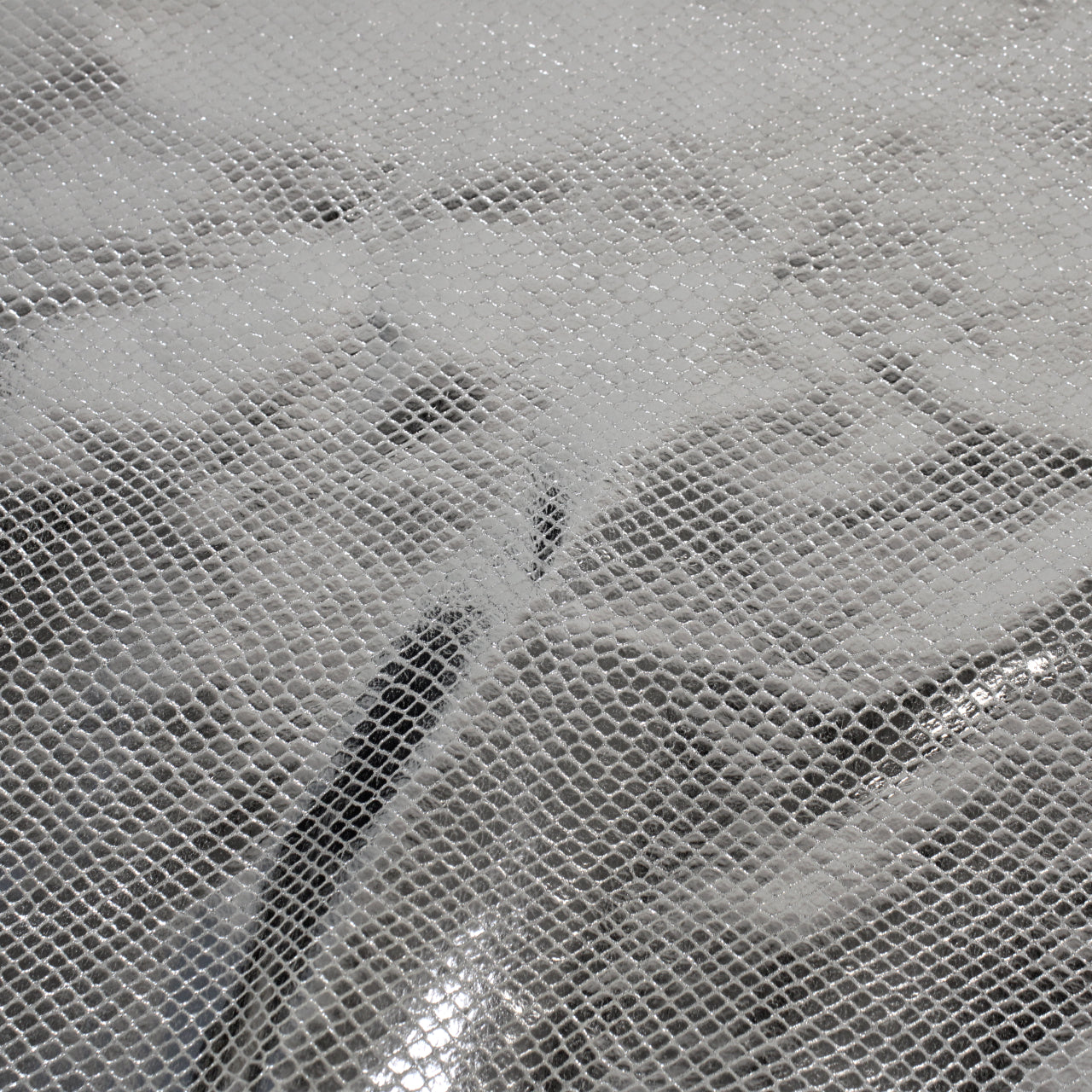 Embossed cowhide with silver metallic finish. Available to order as a hide of 4-5 square feet. As with any real skin, there may be slight variations in dye color, shape, and size.