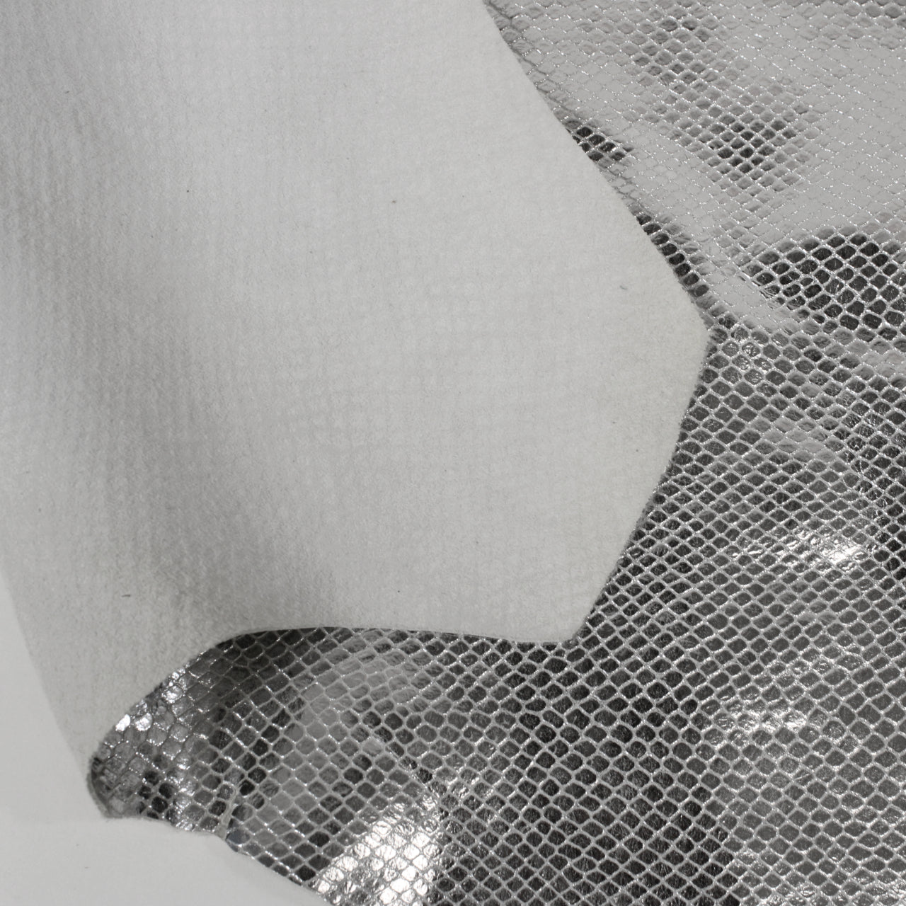 *This leather has a metallic finish with a snakeskin-like texture to its face. It is fairly soft, with ample movement and flexibility to bend and shape. Backside is off-white, smooth, and sanded. Suitable for leather footwear, accessories and apparel use. Very disco!