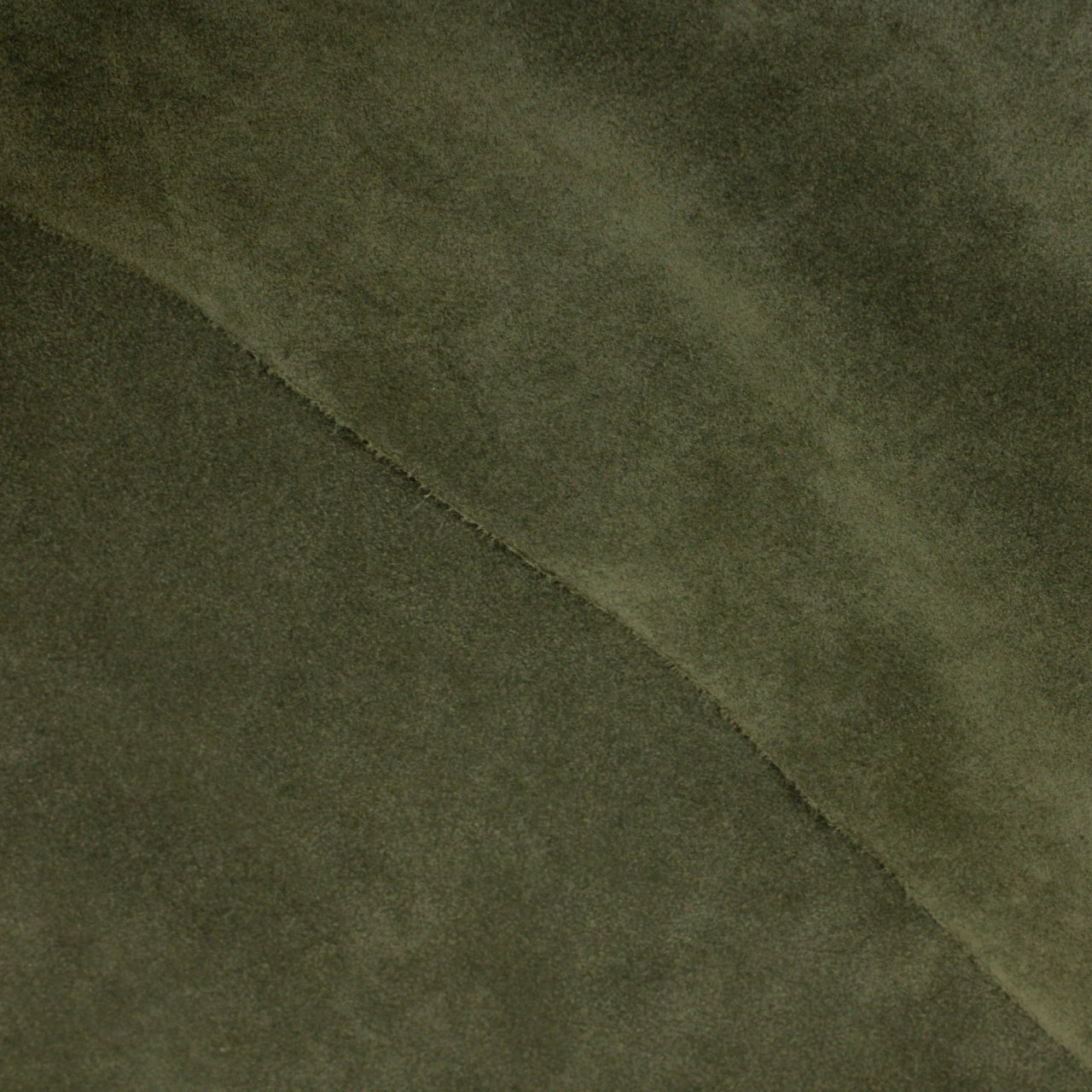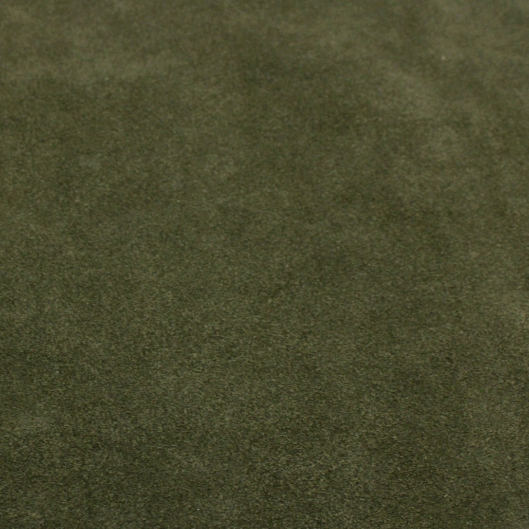 Cowhide suede in an earthy moss color. Available to order as an approximate 5-6 square foot hide piece. As with any real skin, there may be slight variations in dye color, shape, and size.