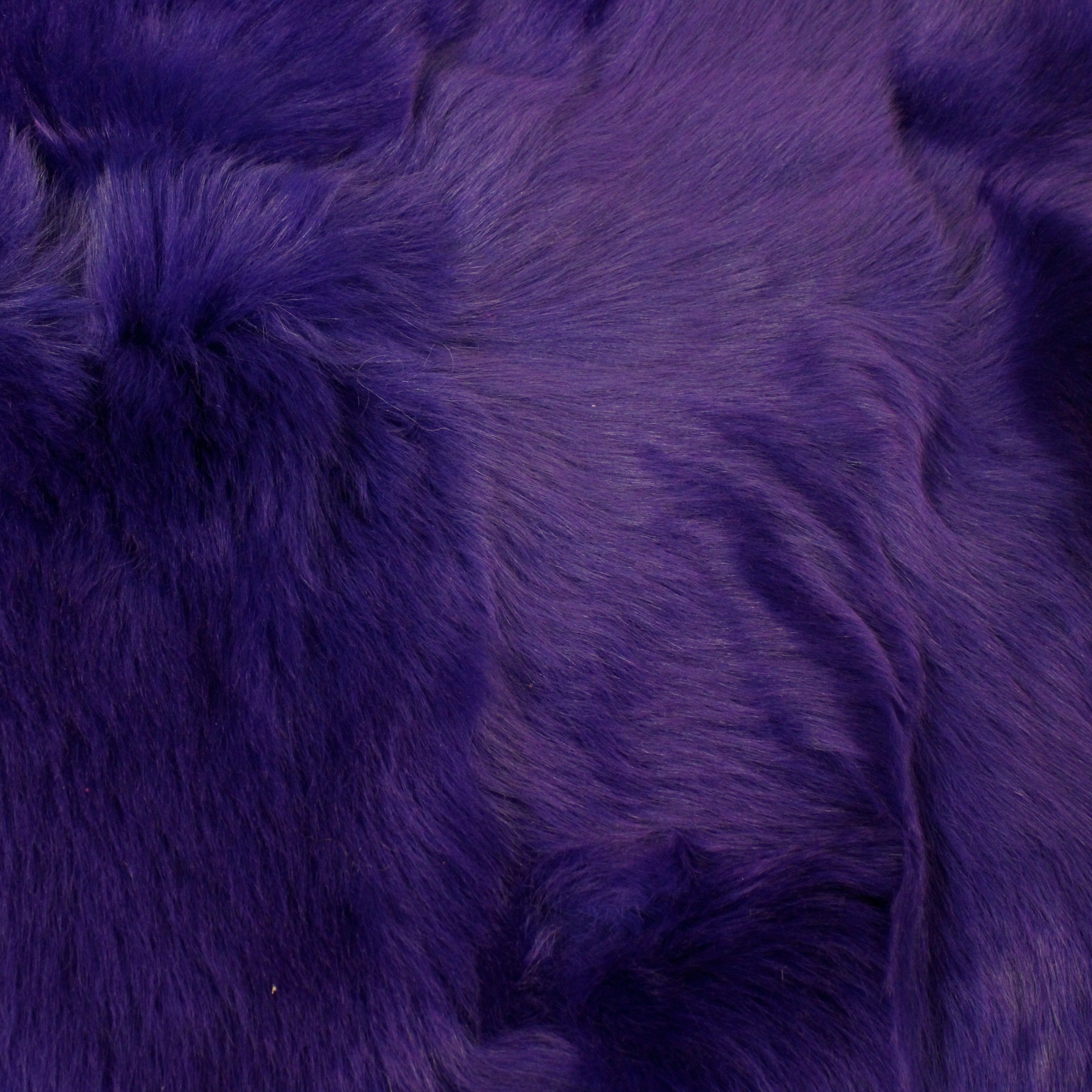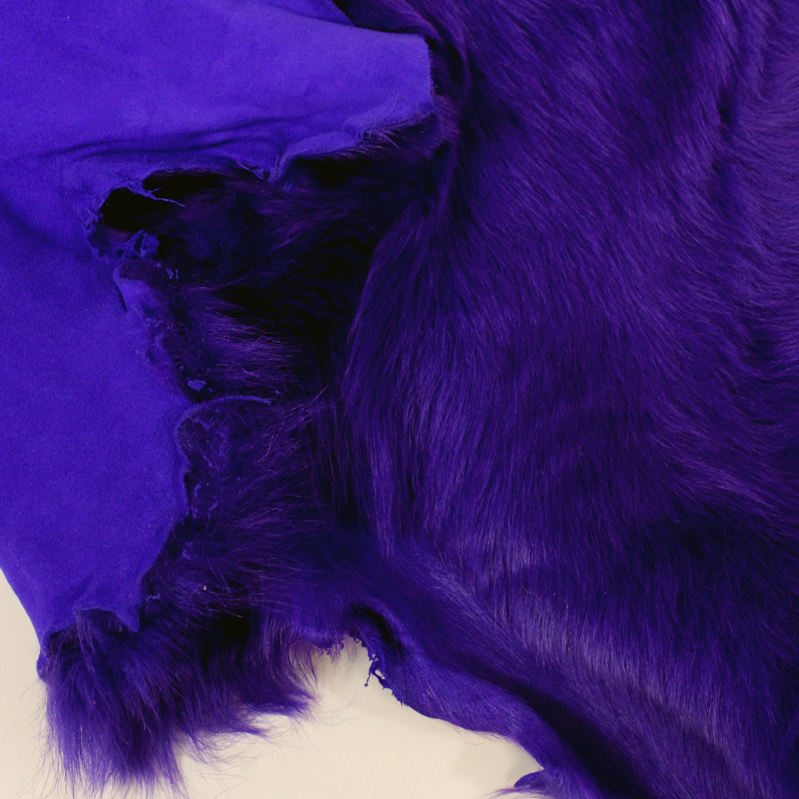 Long hair fur hide with soft suede back in bright royal purple. Exact animal is unknown, but most likely goat (kid). Available in hides of 2-3 square feet. As with any real fur hide, there may be slight variations in dye color, shape, and size.