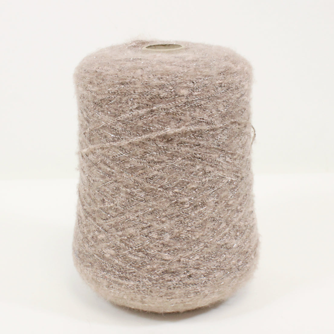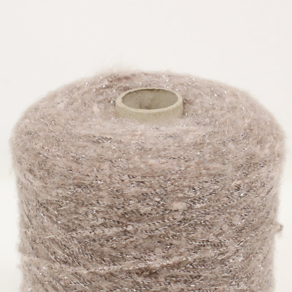 Lightweight spiral yarn in a mauve-grey color with a silver lurex filament. Burn tested for synthetic content. Cone weighs 1.8lbs.