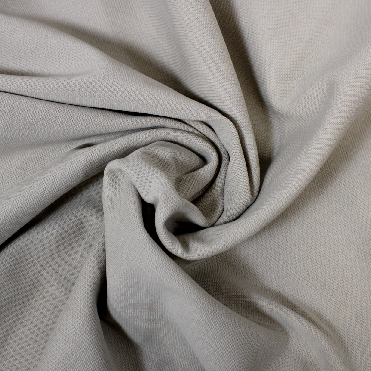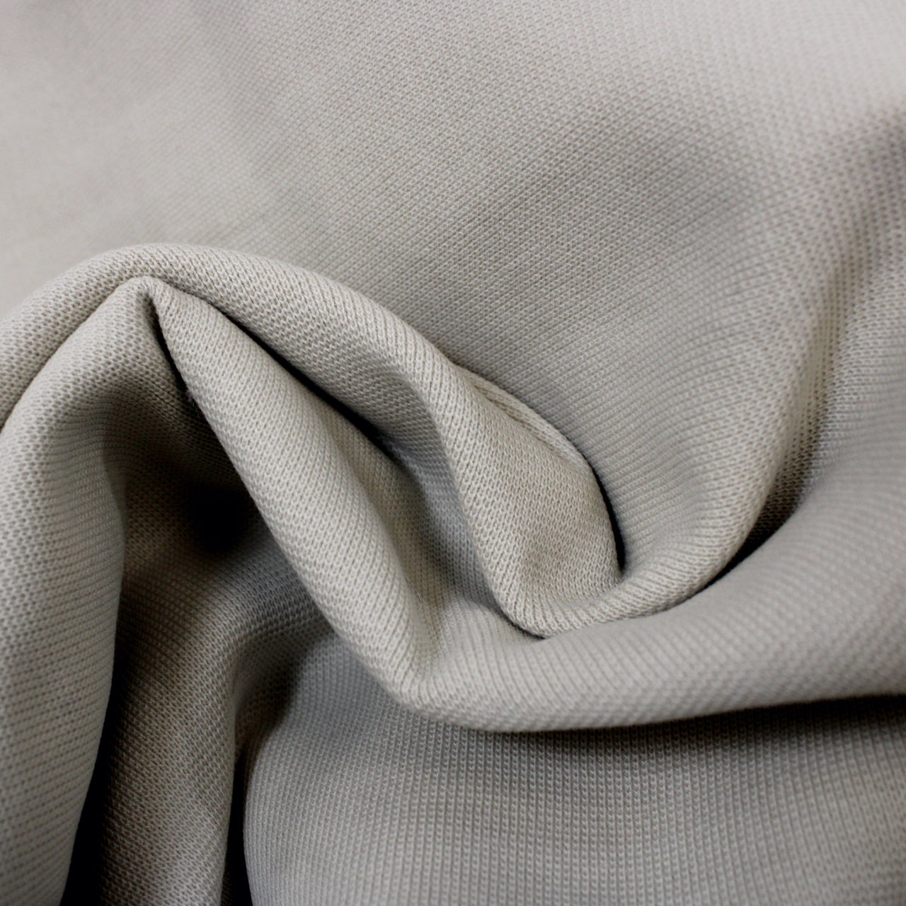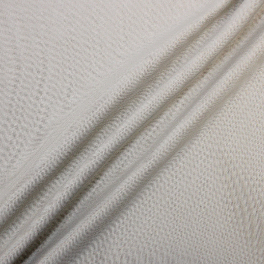 1x1 rib tube-knit jersey available in a pale beige. Fiber content labeled as 97% cotton, 3% elastane. Measures 35.5" in width as a tubular knit and available for order by the yard. Please note: this fabric is knit as a tubular shape, but could easily be cut once to have a doublewide singular layer.