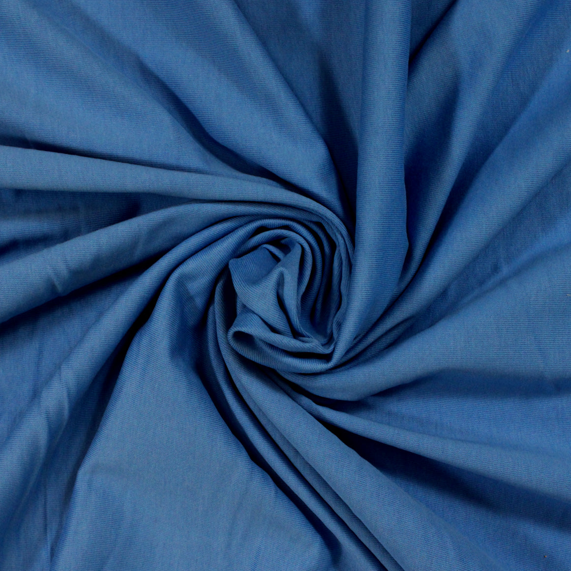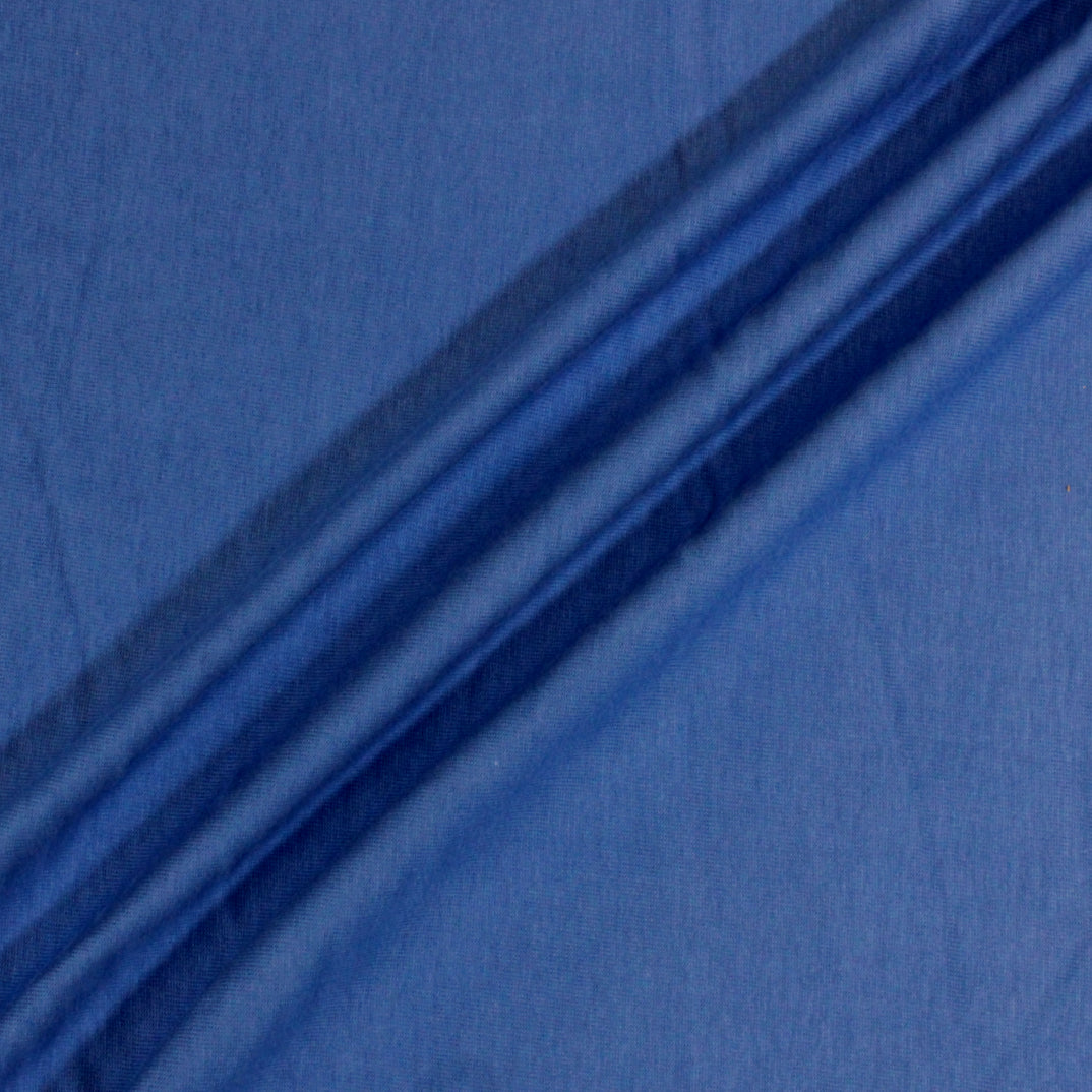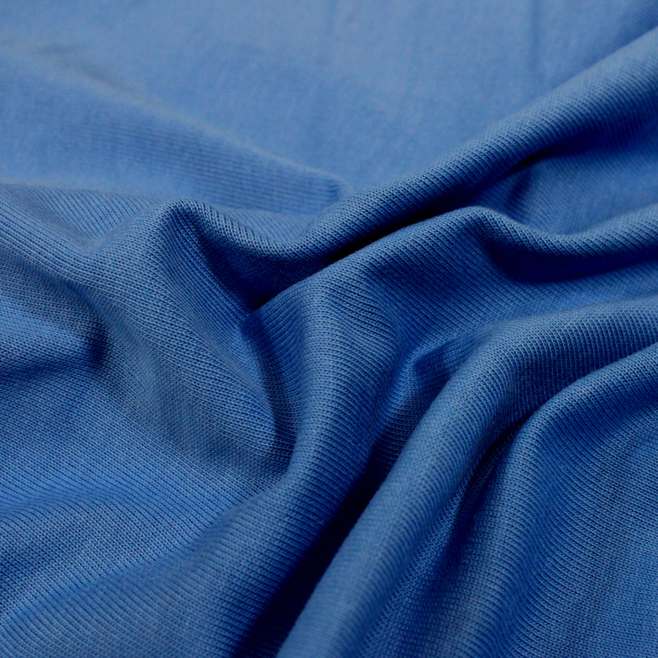 Jersey knit in a bright blue color. Burn tested natural cellulosic content, most likely cotton. Measures 54" in width and available to order by the yard.