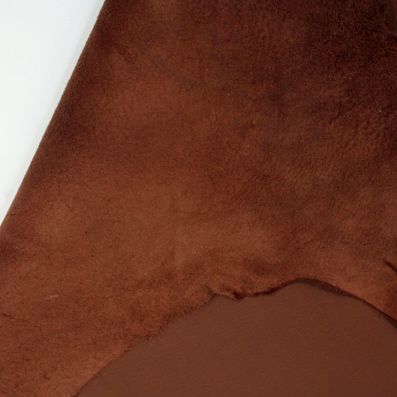 Calfskin hide dyed a burnt sienna brown color with suede back. Available as a 6-7 square foot hide. Labeled as 0.6-0.7mm thickness. As with any real skin, there may be slight variations in dye color, shape, and size.