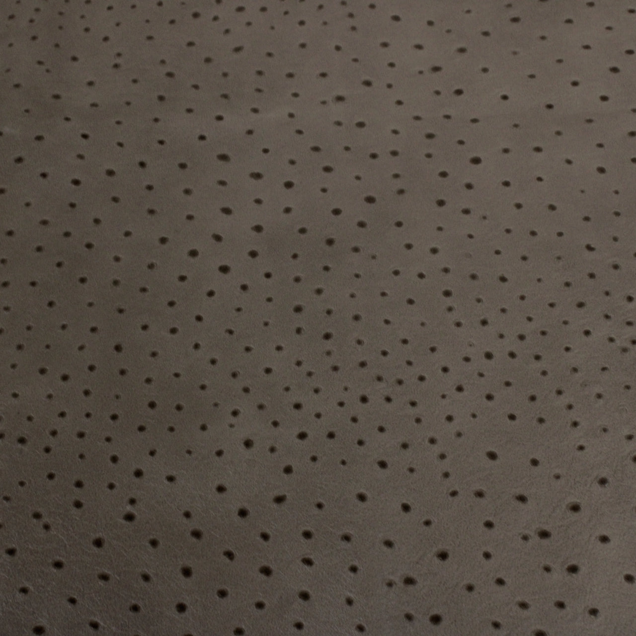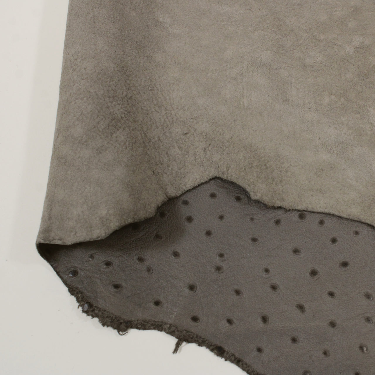Lambskin leather in earl grey with a suede backside and texture-finished face, mimicking the look and feel of ostrich leather. Available to order by the hide, sized 8-9 square feet. Labeled as 0.6-0.8mm thickness. As with any real skin, there may be slight variations in dye color, shape, and size.