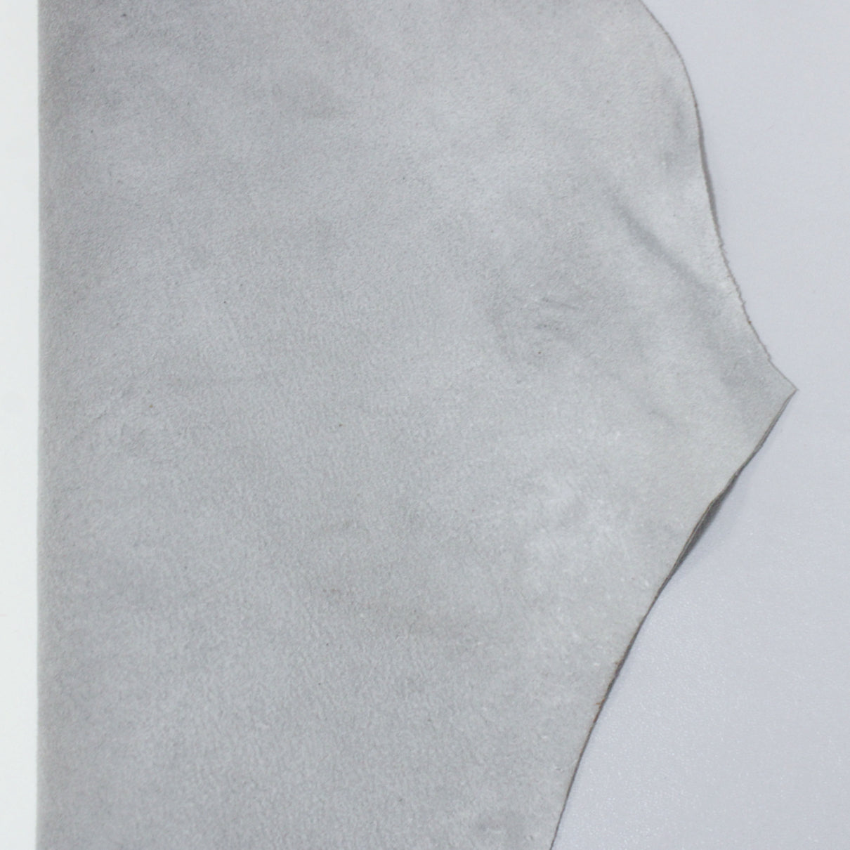 Lambskin leather in a light fog grey color with soft sueded backside. Available to order as a 5-6 square foot hide. As with any real skin, there may be slight variations in dye color, shape, and size.