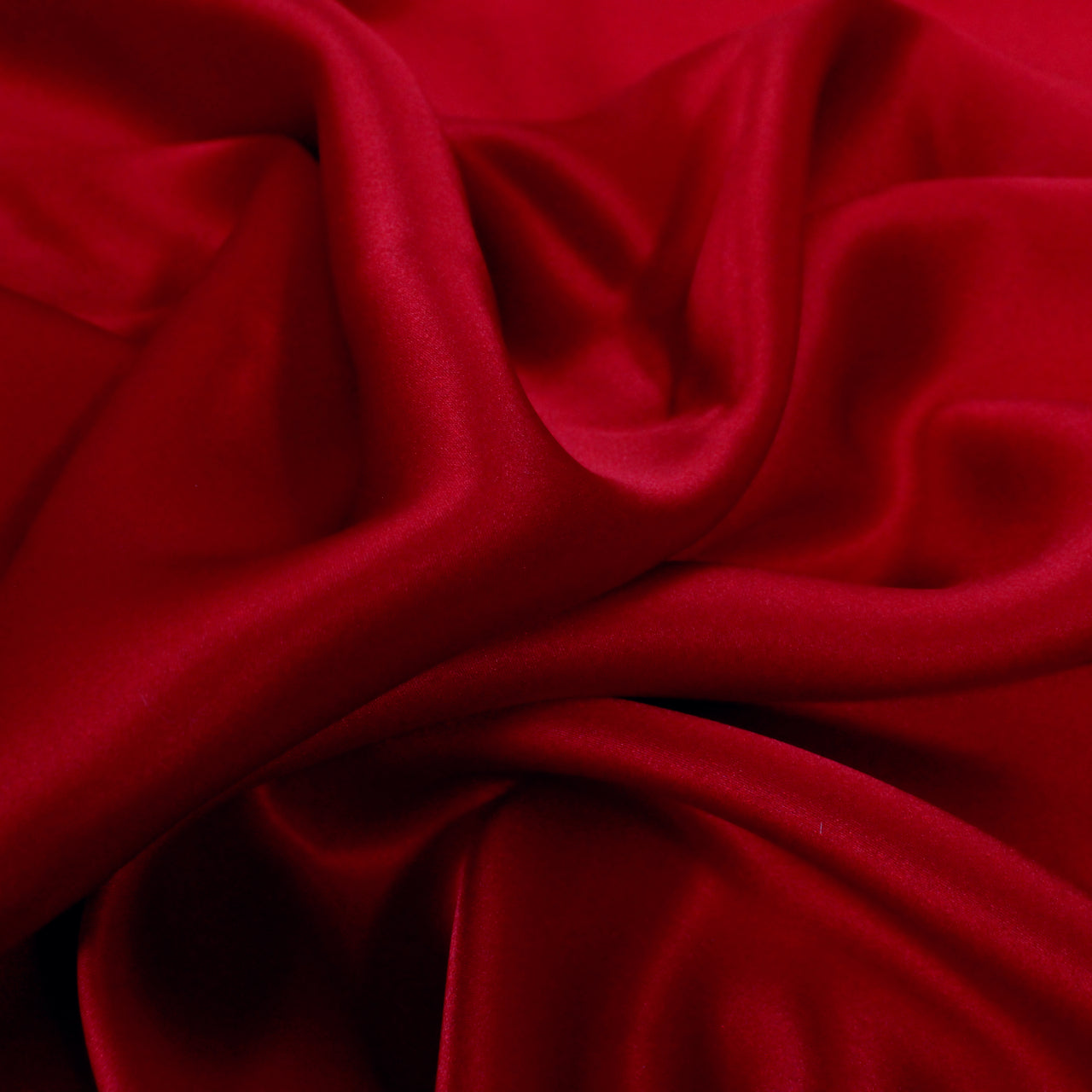 Silk charmeuse in ruby red. Burn tested silk content. Measures 56" in width and available for order as a 1.5 yard piece.