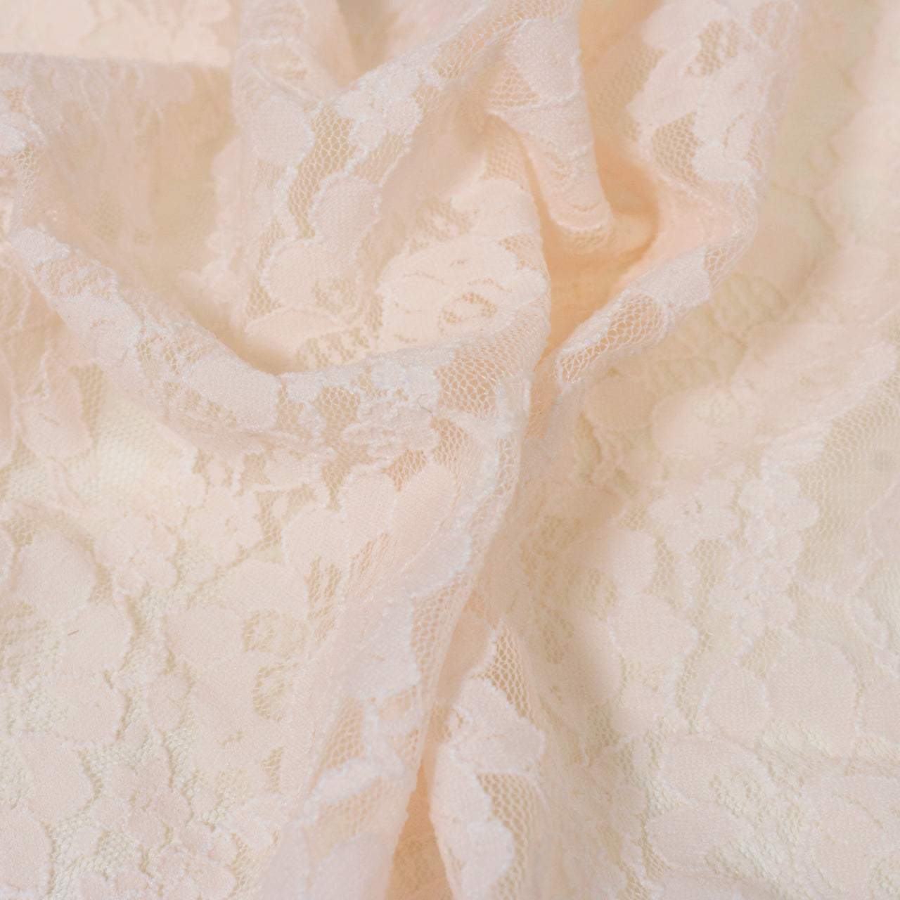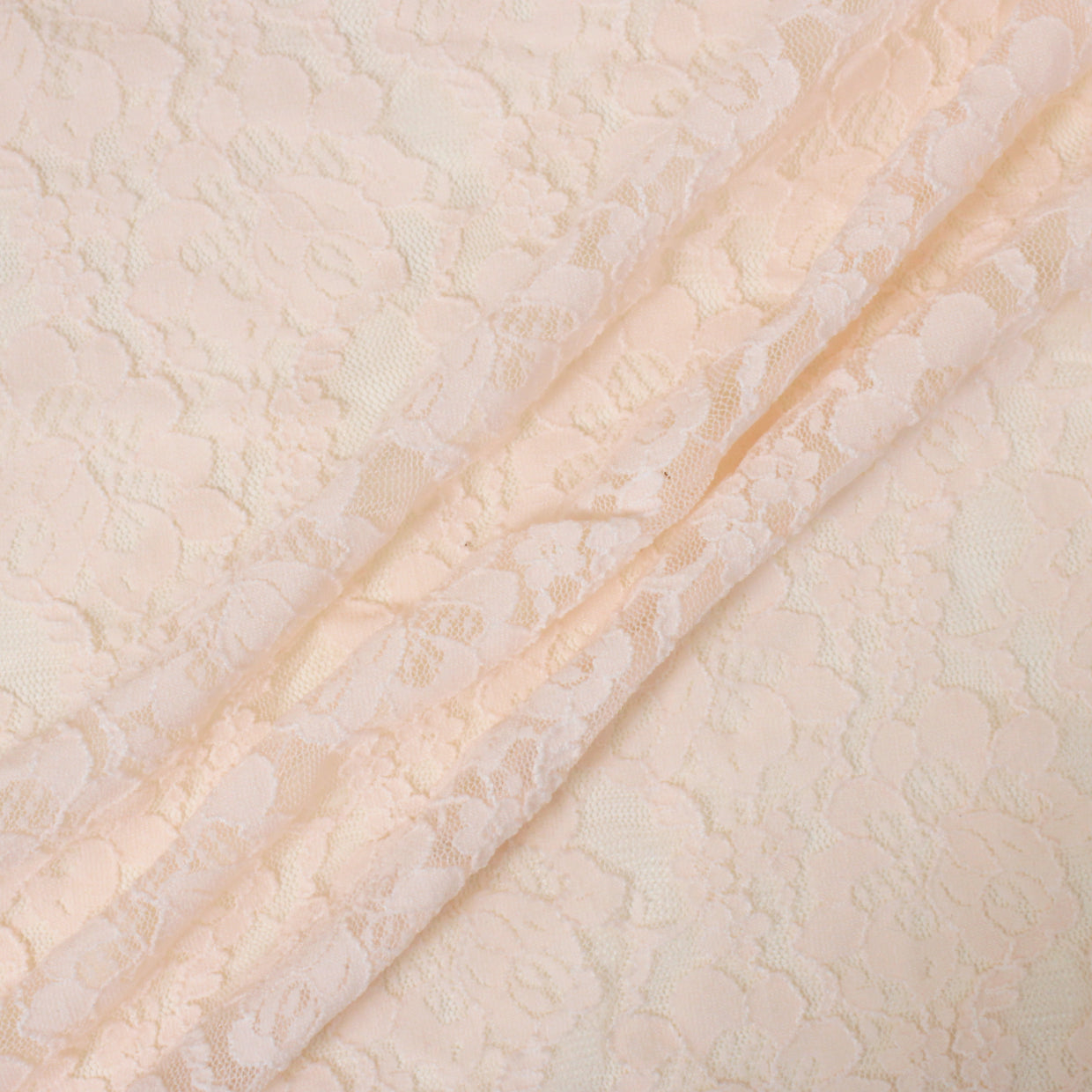 Porcelain pink stretch lace mesh with all-over floral pattern. Burn tested synthetic content. Measures 50" in useable width and available for order as a 1 yard piece.