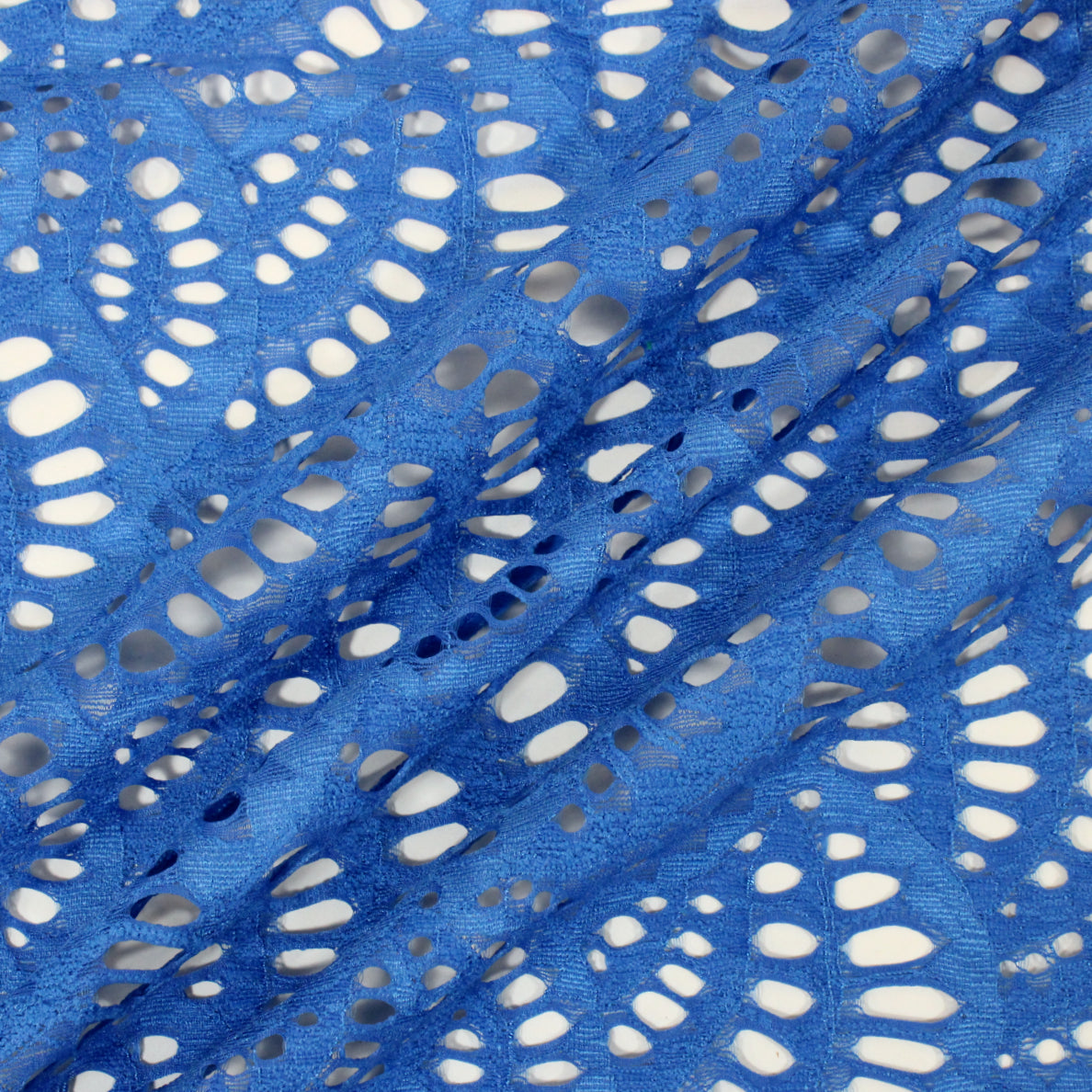 Scallop patterned lace in manganese blue. Burn tested as mixed synthetic content. Measures 58" in width and available for order as a 2.5 yard piece.