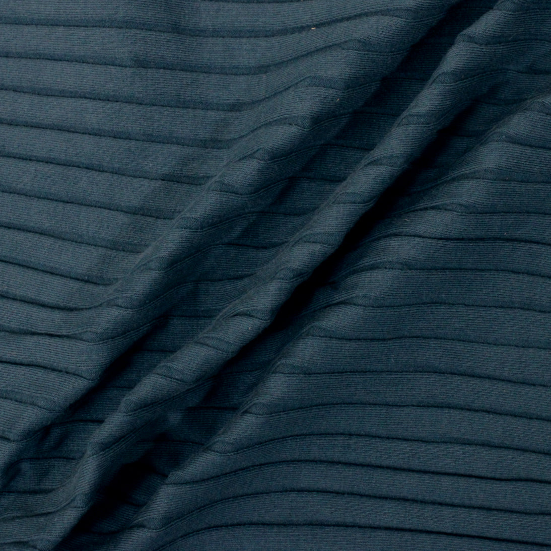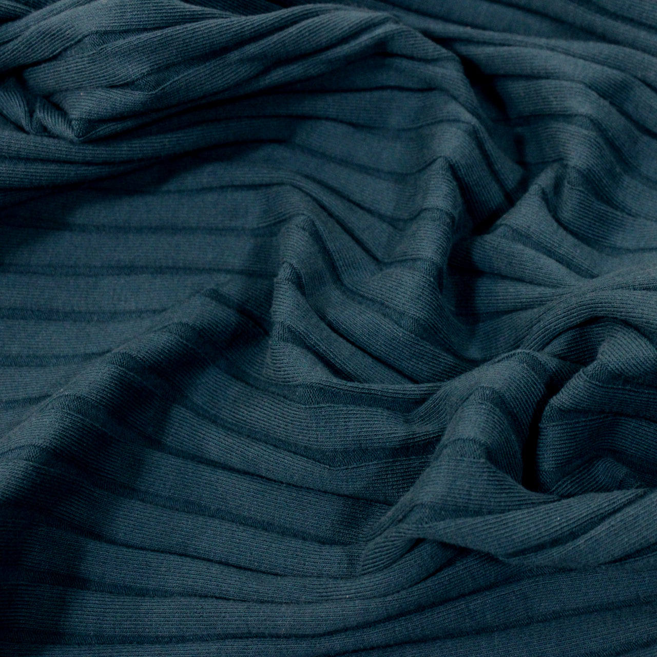 Deep teal colored lightweight rib knit fabric. Burn tested cellulosic content, likely cotton or rayon. Measures 43" in width (when not stretched) and available for order as a 2.5 yard piece.