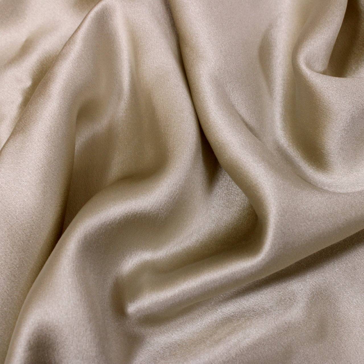 Silk charmeuse in a classic champagne color. Burn tested 100% silk content. Measures 44" in width and available for order as a 2 yard piece.