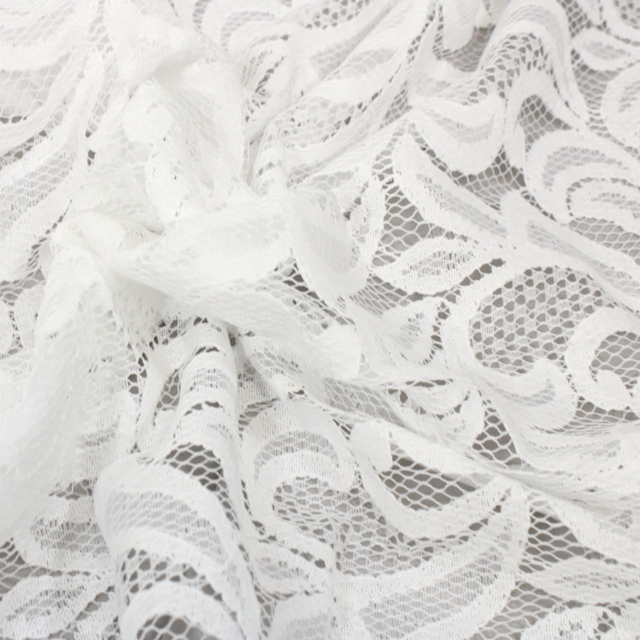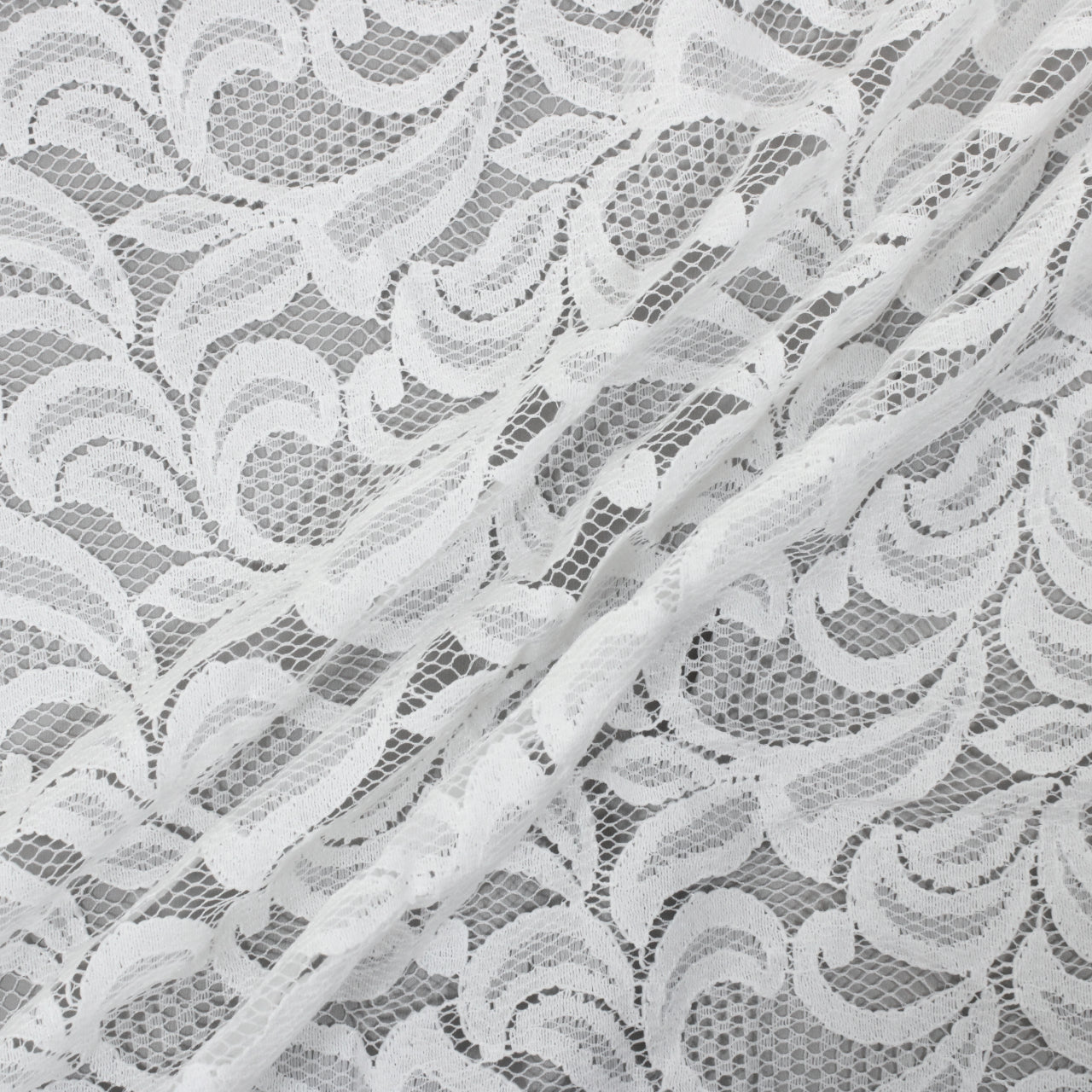 Scroll patterned lace in pure white. Burn tested as mixed synthetic content. Measures 57.5" in width and available for order as a 3 yard piece.