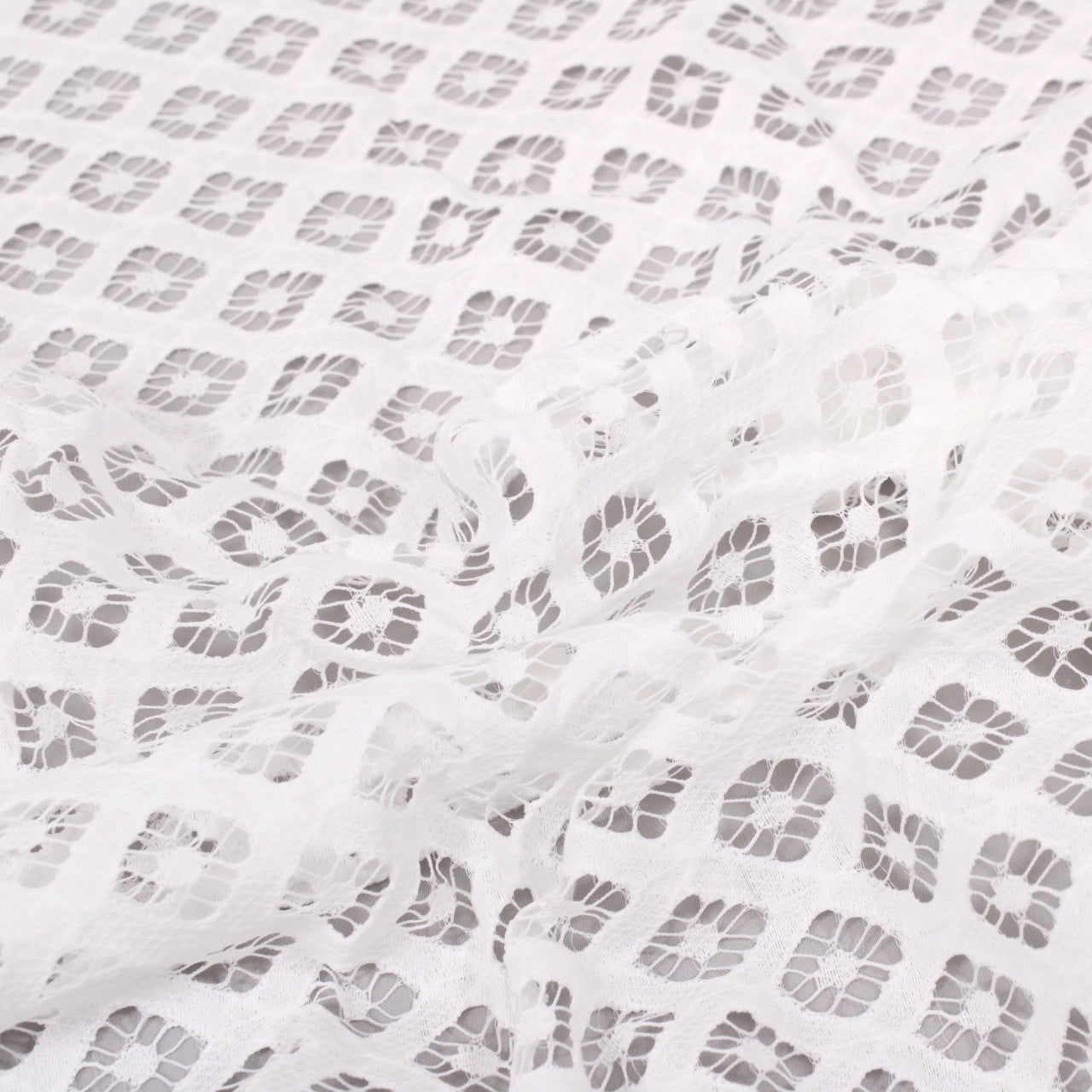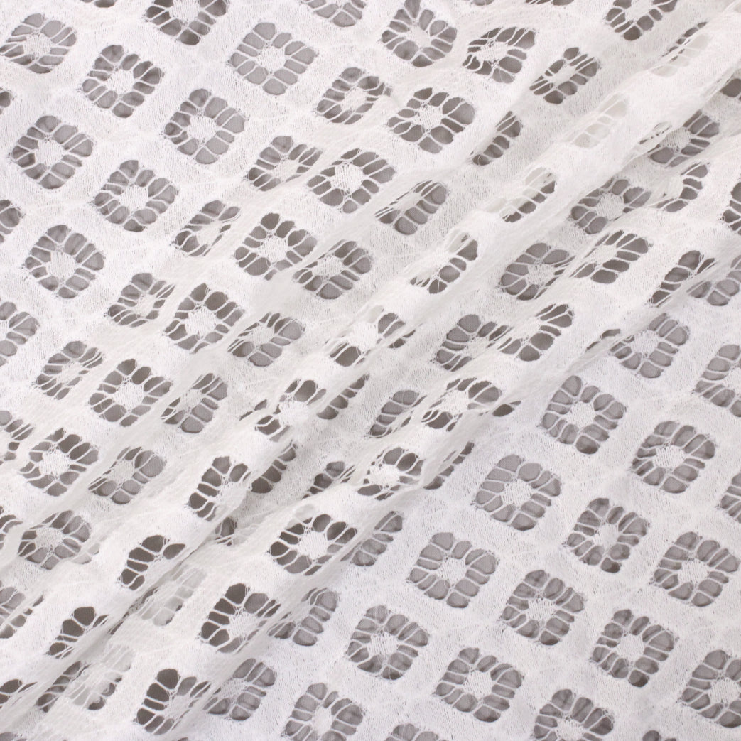 Diamond patterned lace in alabaster white. Burn tested as mixed synthetic content. Measures 57" in width and available for order as a 4 1/4 yard piece.
