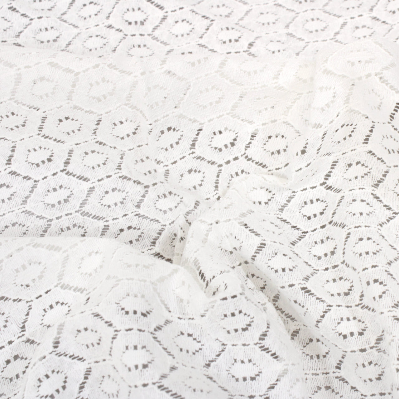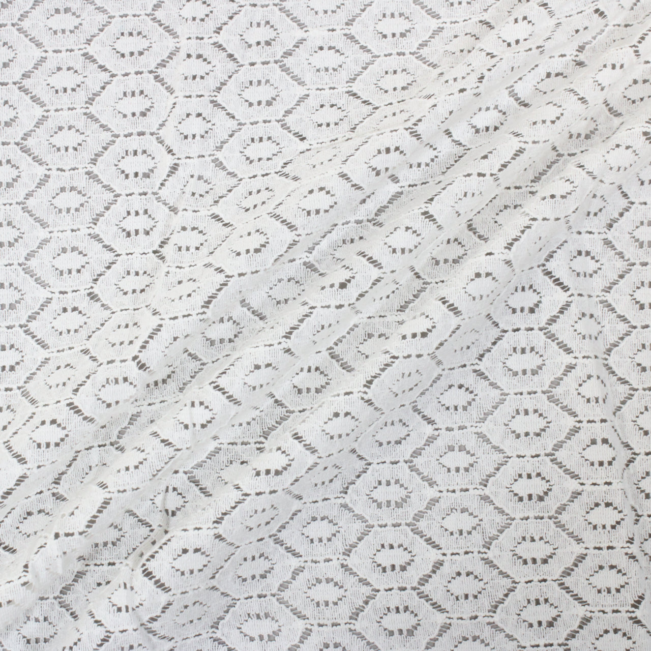 Geometric patterned lace in classic white. Burn tested mixed-synthetic content. Measures 58.5" in width and available for order as a 4.5 yard piece.