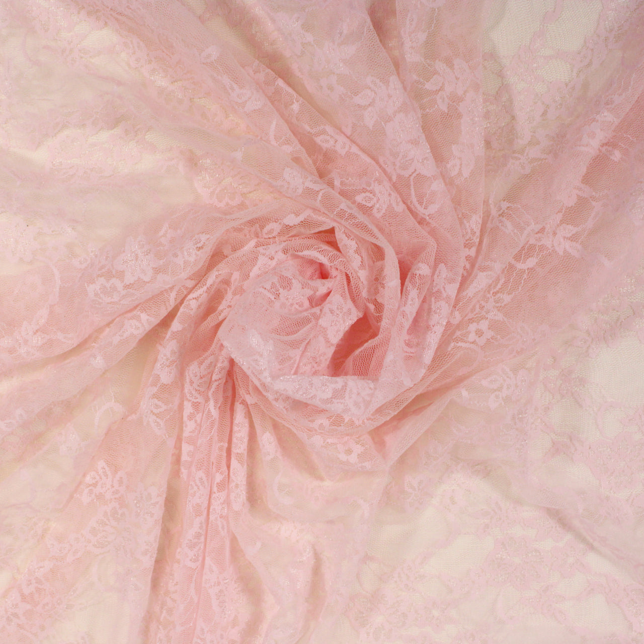 Baby pink stretch-mesh lace with all-over trellis-floral pattern. Burn tested synthetic content. Small cuts made to selvedge, but measures 54" in useable width and available for order as a 5 yard cutting.