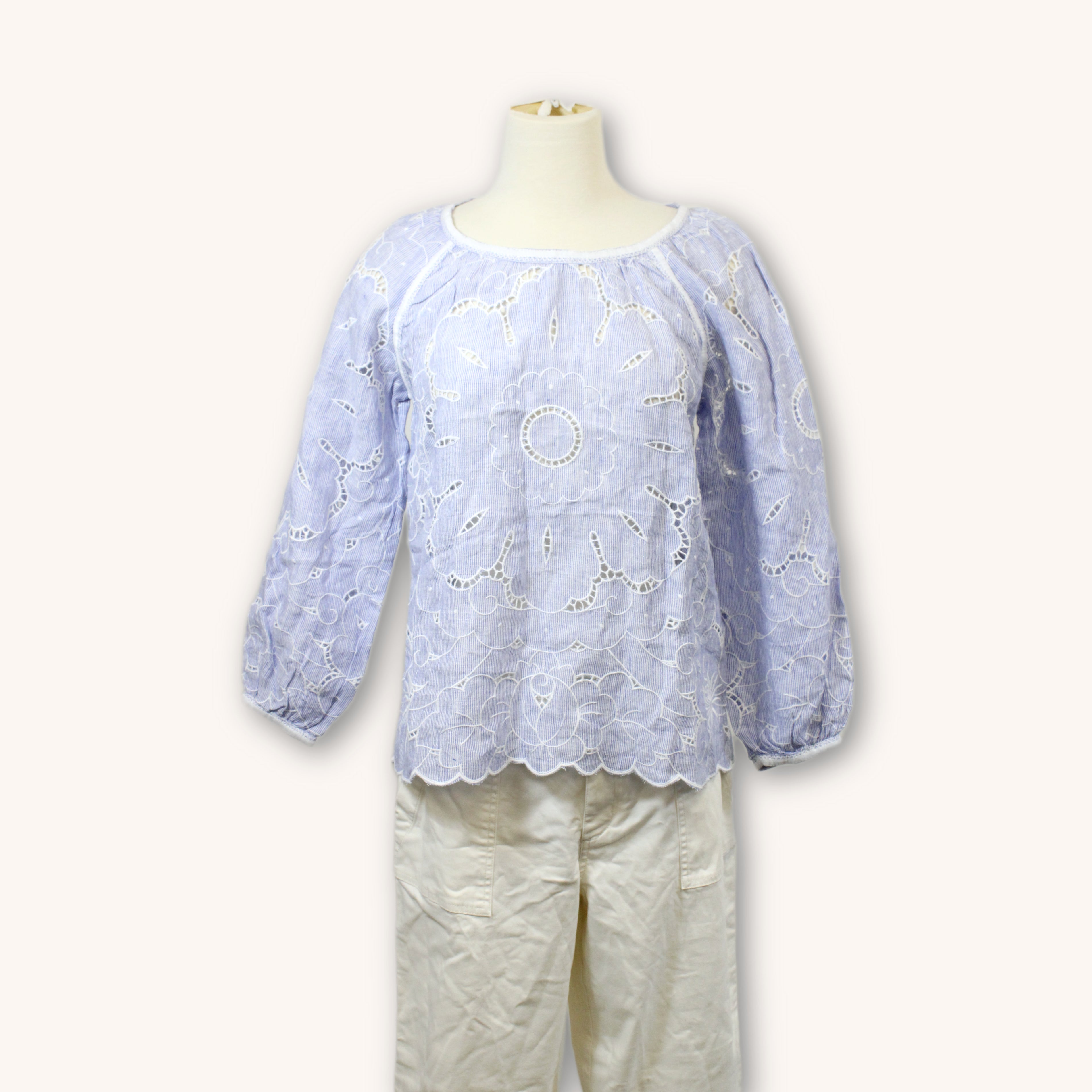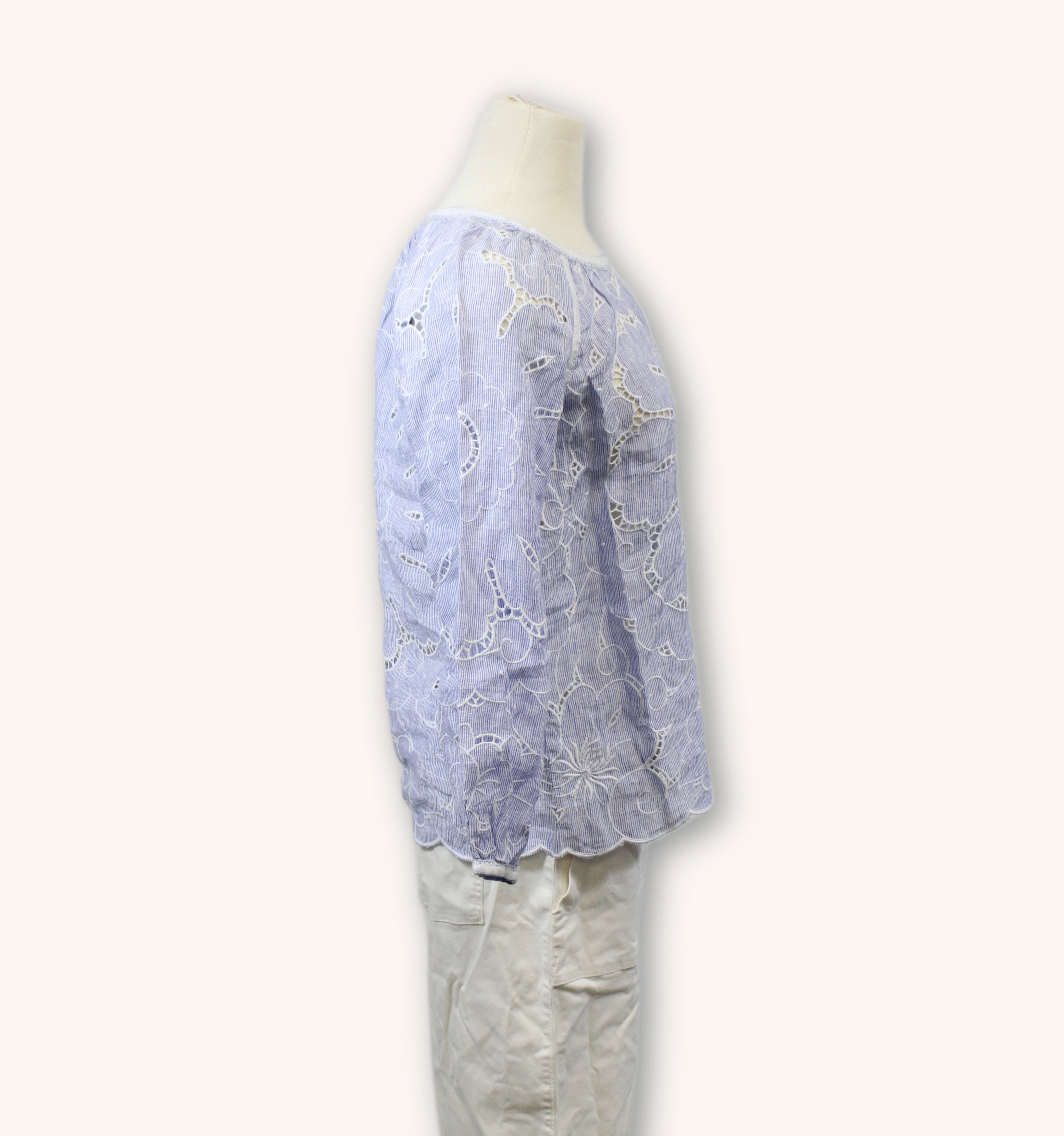 Blue and white pinstripe blouse with embroidered cutout designs. Labeled as 100% Linen.