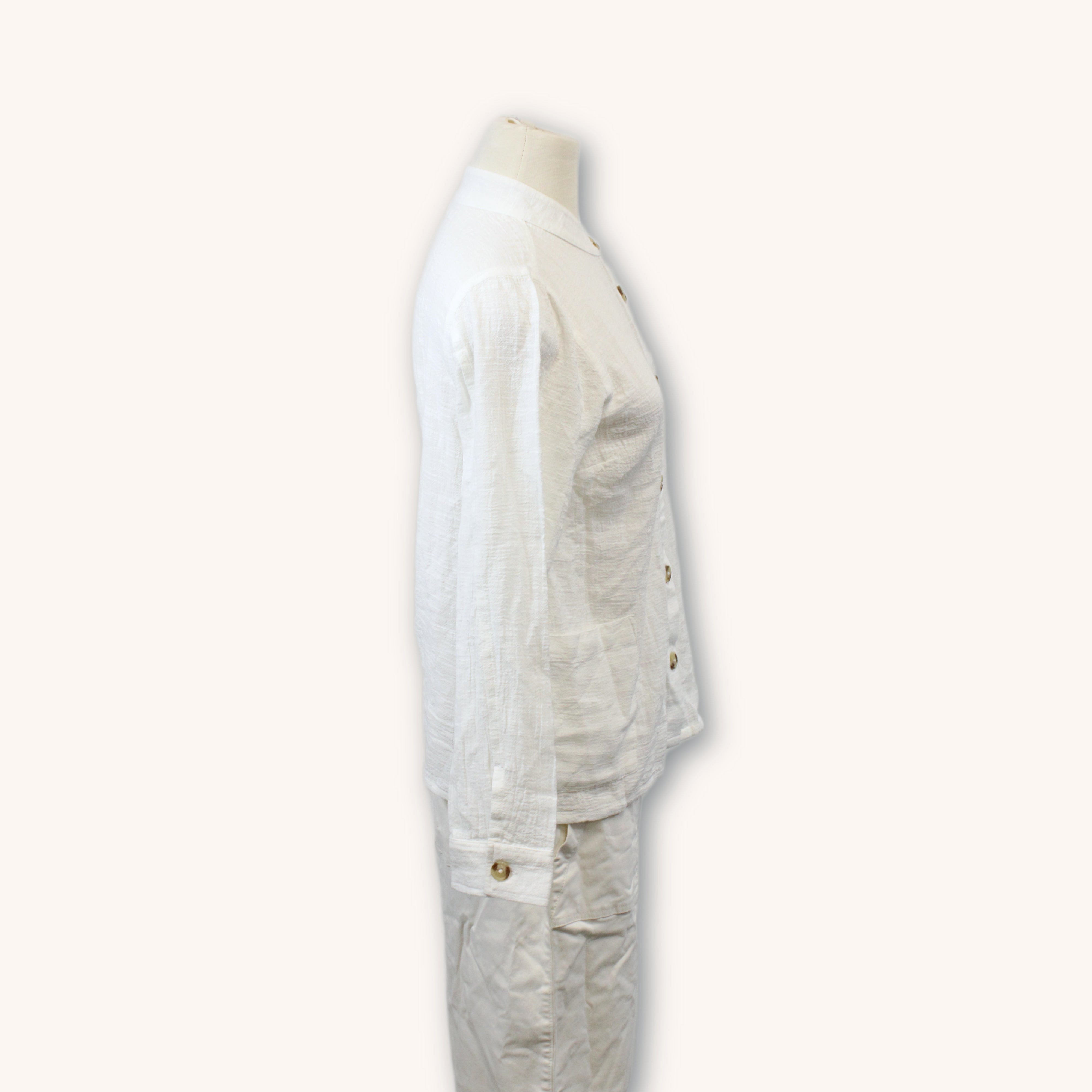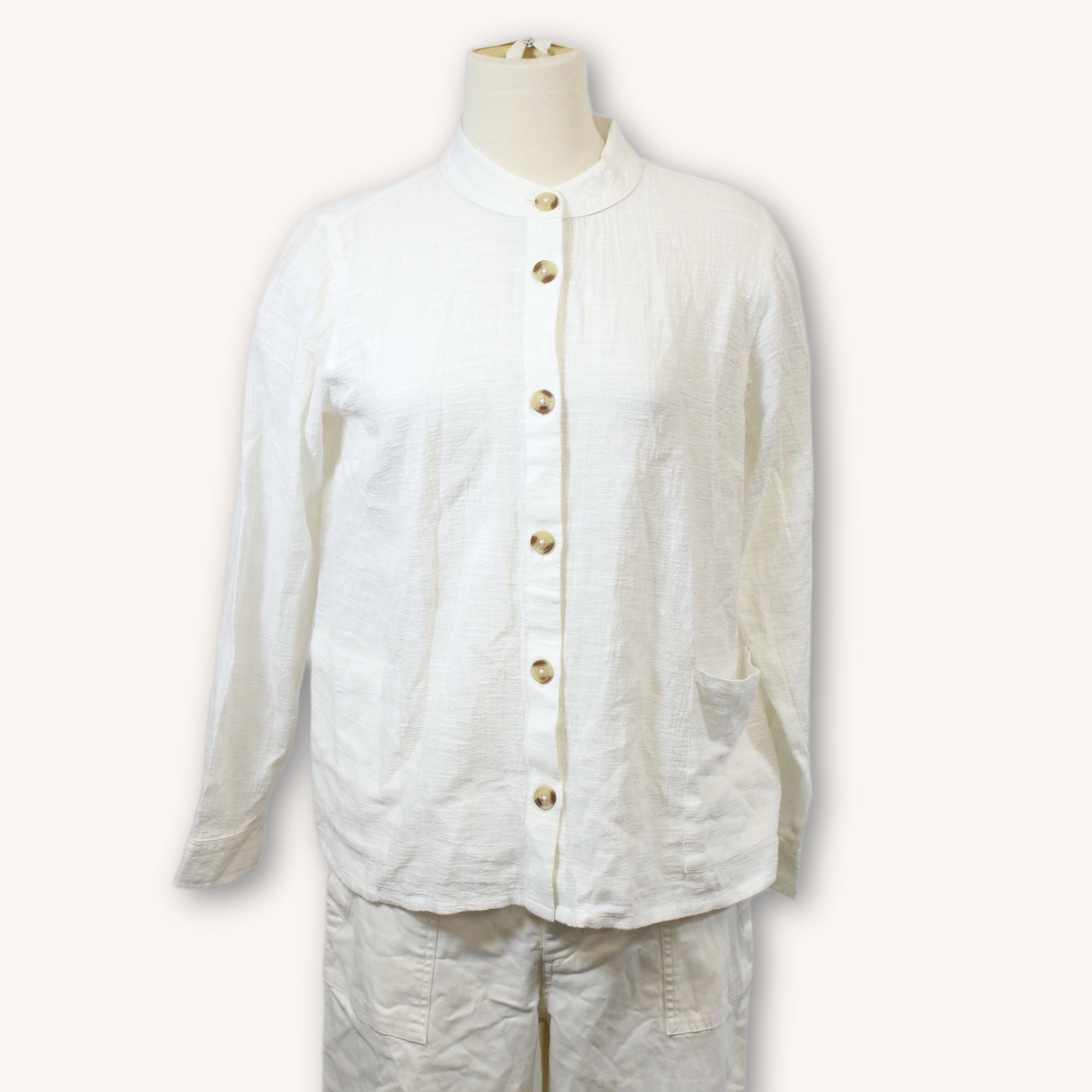 White button up shirt in a gauzy white fabric with faux horn buttons. Labeled as a Small.