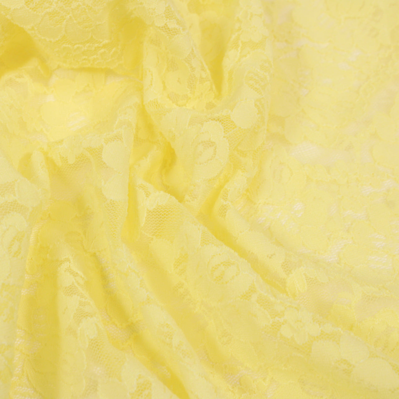 Banana yellow stretch lace mesh with all-over floral pattern. Burn tested synthetic content. Measures 50" in useable width and available for order as a 1.5 yard piece.