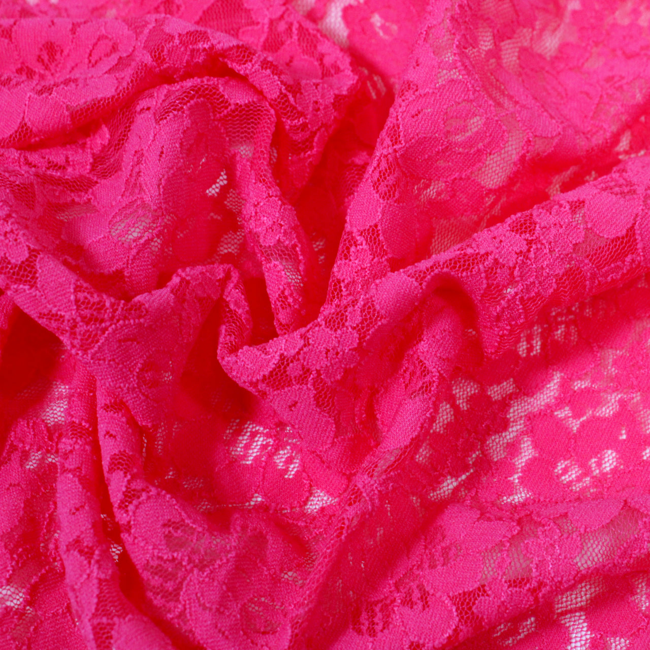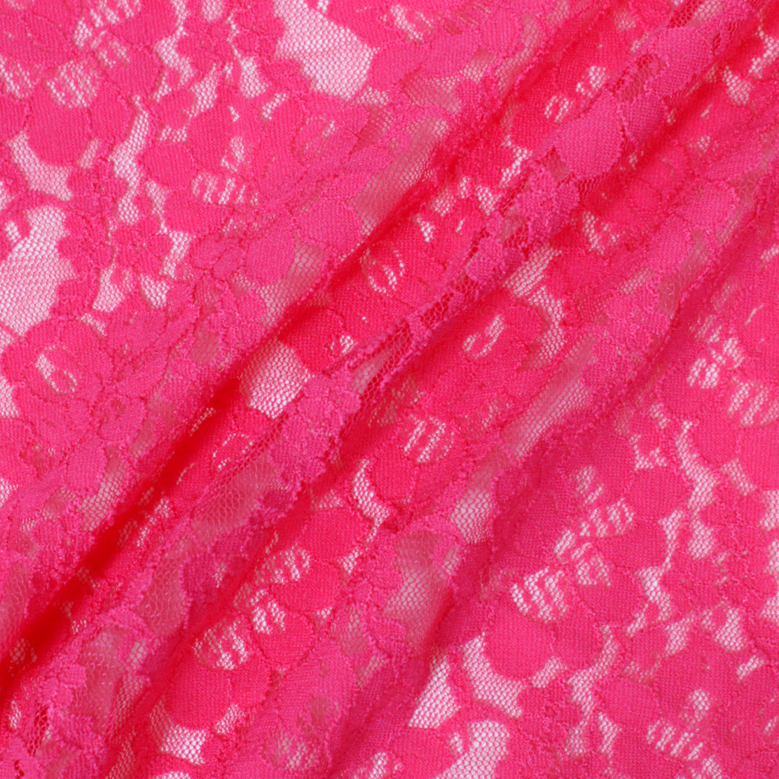 Strawberry pink stretch lace mesh with all-over floral pattern. Burn tested synthetic content. Measures 50" in useable width and available for order as a 1.75 yard piece.