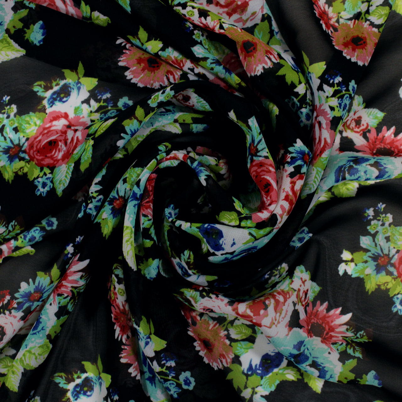 Black chiffon with a multicolor floral print. Burn tested synthetic content. Measures 57“ wide and available for order by the yard.
