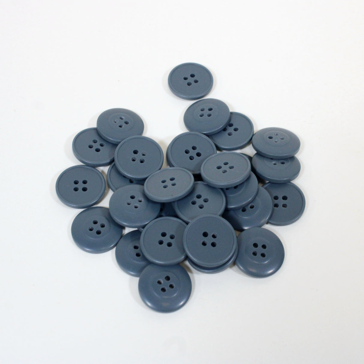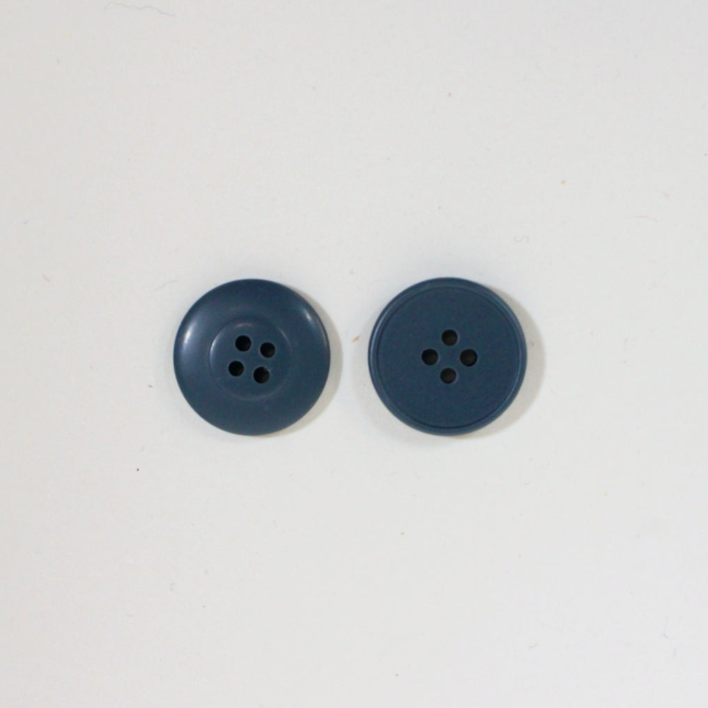 Matte blue 4-hole buttons, most likely made from plastic. Measures 24L (approximately 15mm) in diameter. Available for order by the dozen.