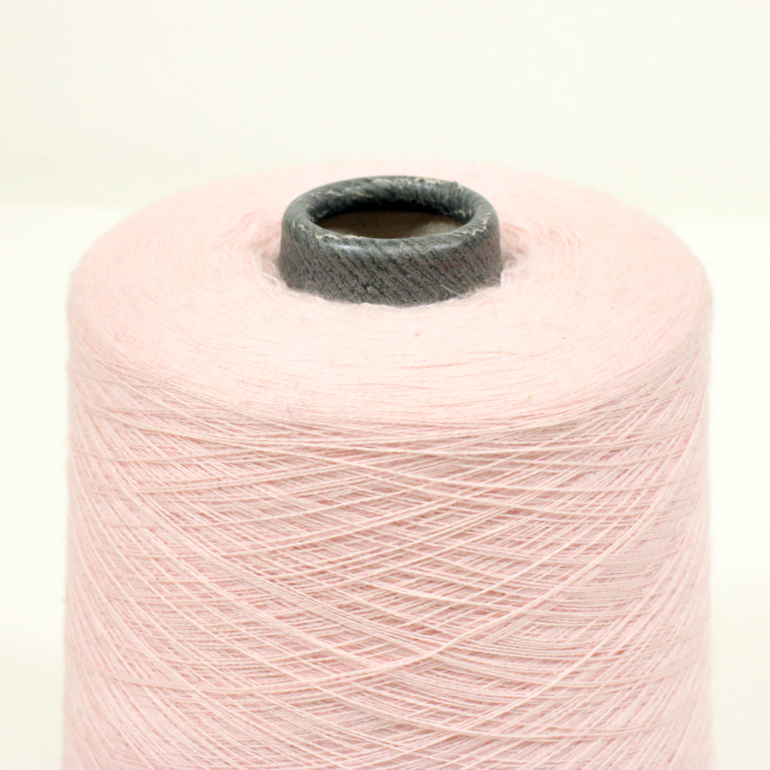 Ultra-fine ballerina pink colored yarn. Labeled as 85% Supima Cotton, 15% Cashmere. Gauge is marked as 2/50NM. Available for purchase as 1lb and 2lb cones.