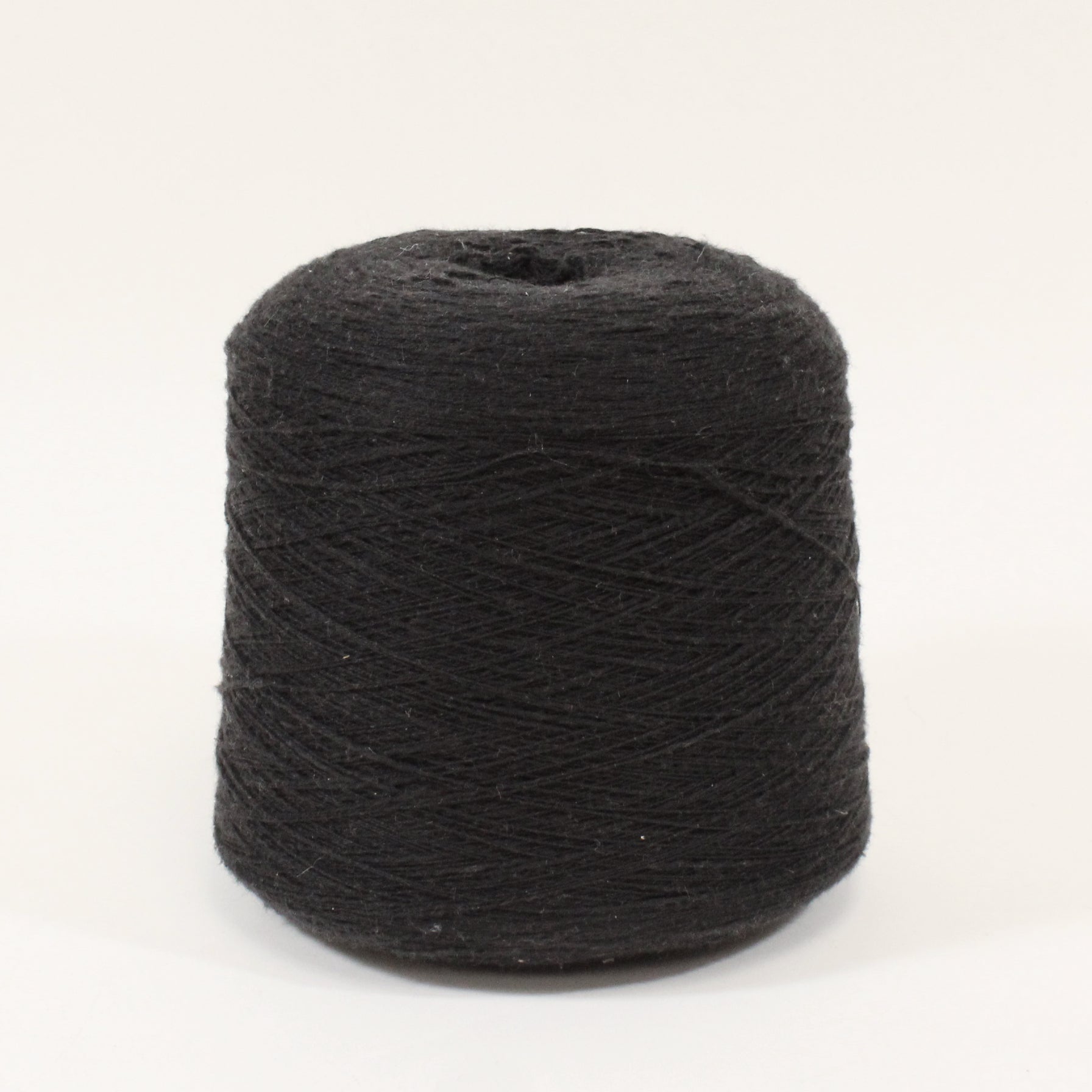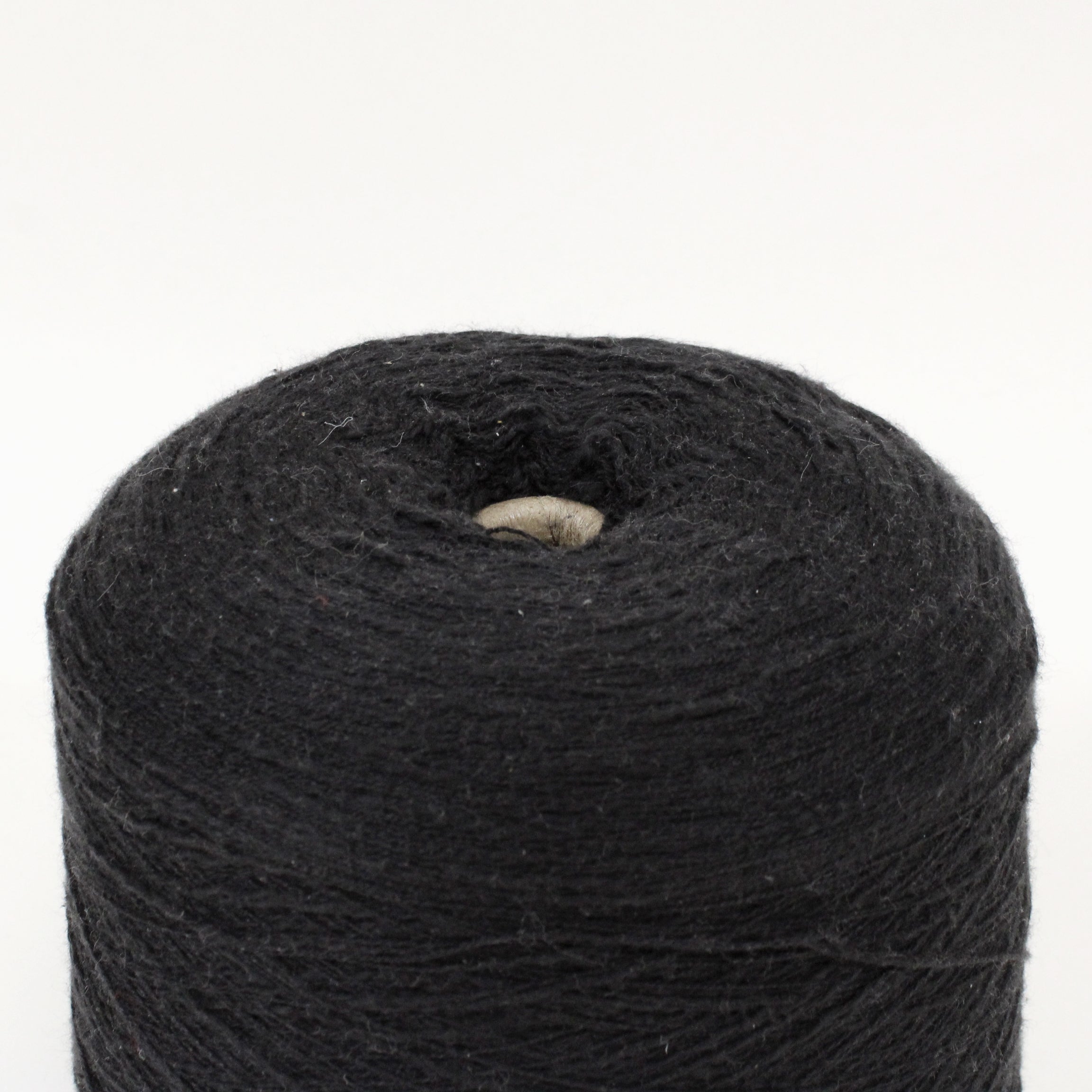 This ultra-fine, black yarn has small slubs throughout. It is labeled as 100% cotton. Cone weighs 2.8lbs.