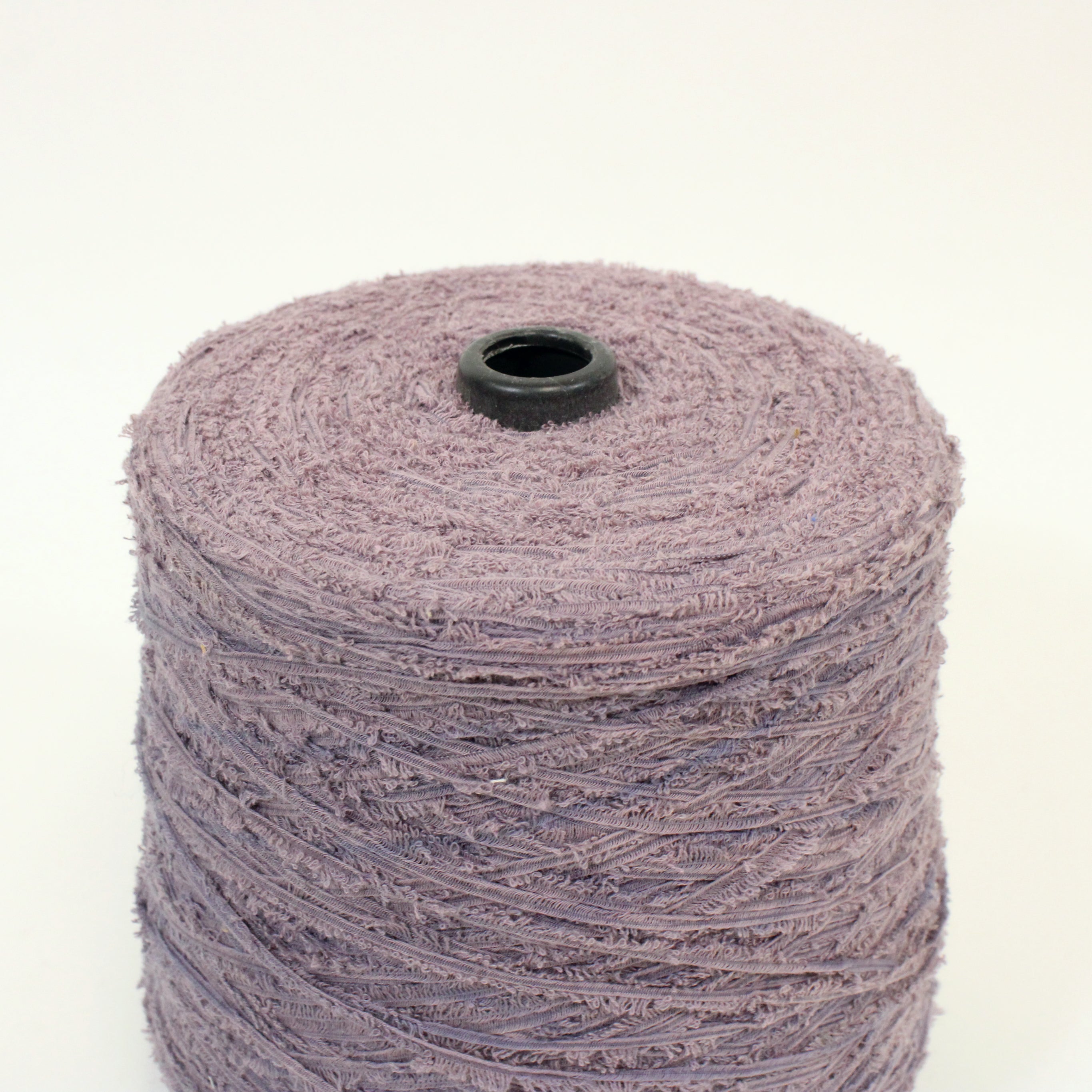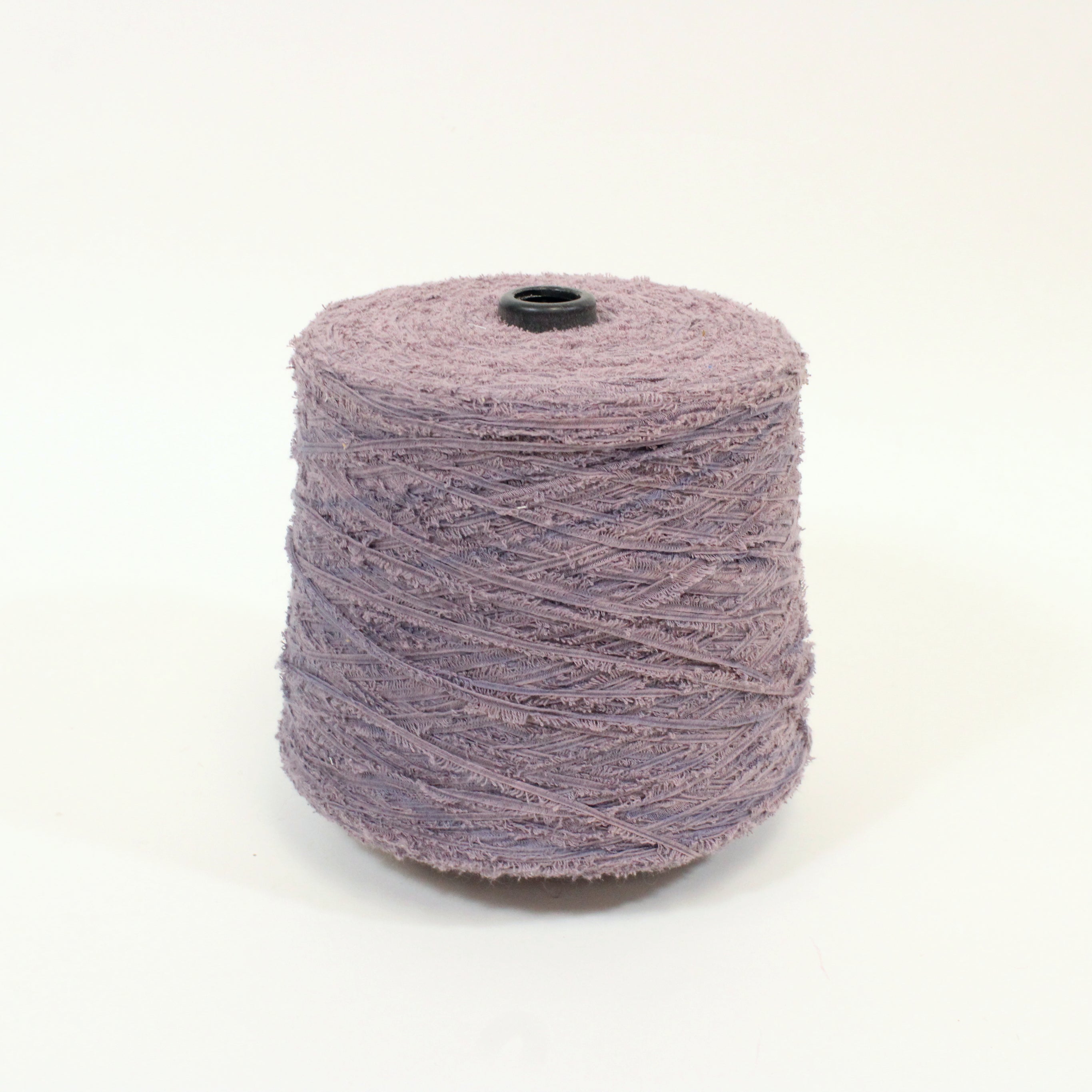 Eyelash yarn available in a dusky purple color. Labeled 80% cotton, 20% nylon. Marked as 1/2.2NM gauge. Available as a 2.6lb cone.