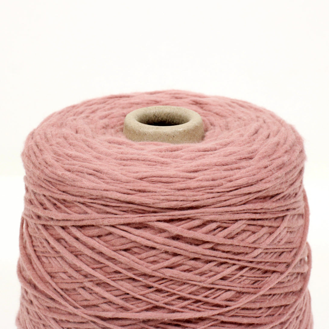 Medium-weight dusty rose colored core-yarn of varying thickness. Labeled as 100% cotton. Gauge is marked as 1/1.8NM. Available for purchase as 1.75lb cones.