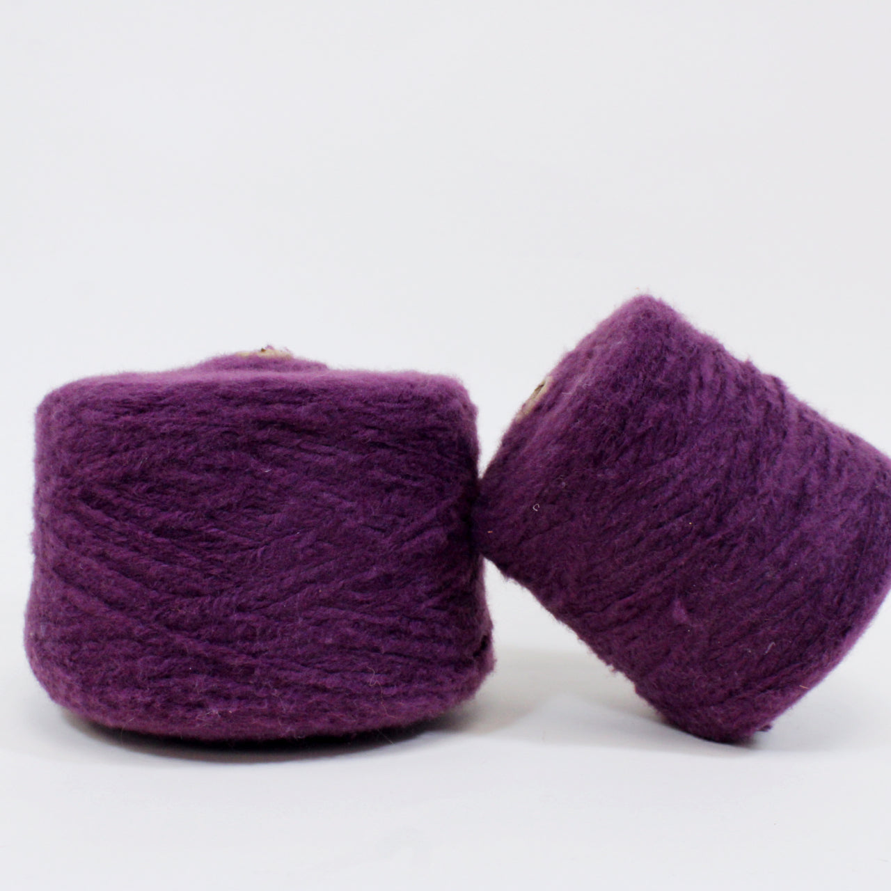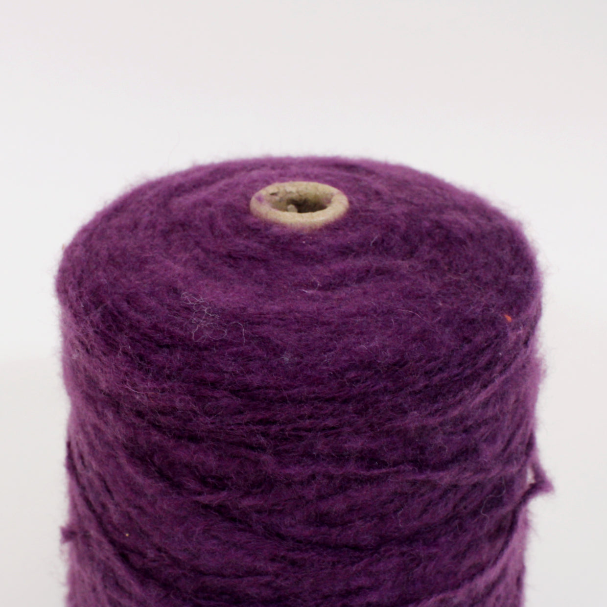 Bulky, fuzzy, eggplant colored yarn. Labeled as 40% acrylic, 40% wool, and 20% nylon. Available for purchase as 1lb or 2lb cones.