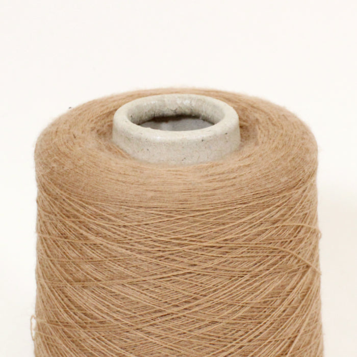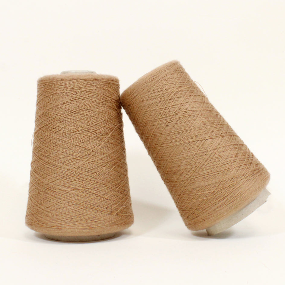 Ultra-fine fawn brown colored yarn. Labeled as 90% virgin wool, 10% cashmere. Gauge is marked as 2/64NM. Available for purchase as approximate .75lb cones.