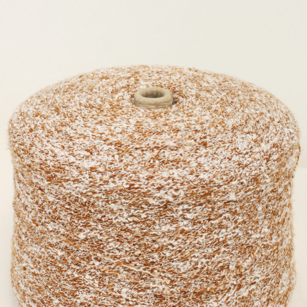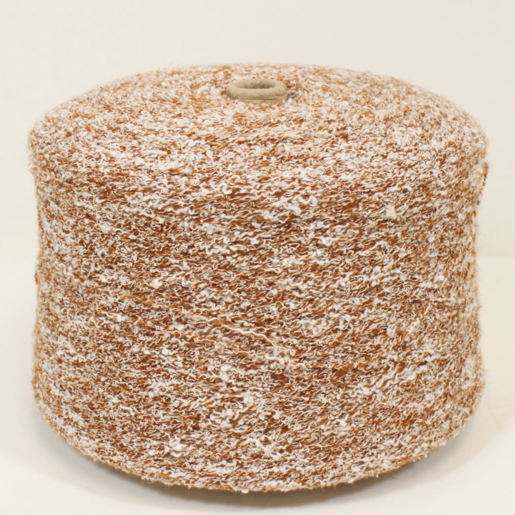 Lightweight yarn of curly cinnamon and white colored fibers. Fiber content is labeled as 54% cotton, 25% acrylic, 11% nylon, 5% polyester, 3% wool, and 2% spandex. Yarn size is labeled as 5.3/1NM, and the cone weighs 5.6lbs.