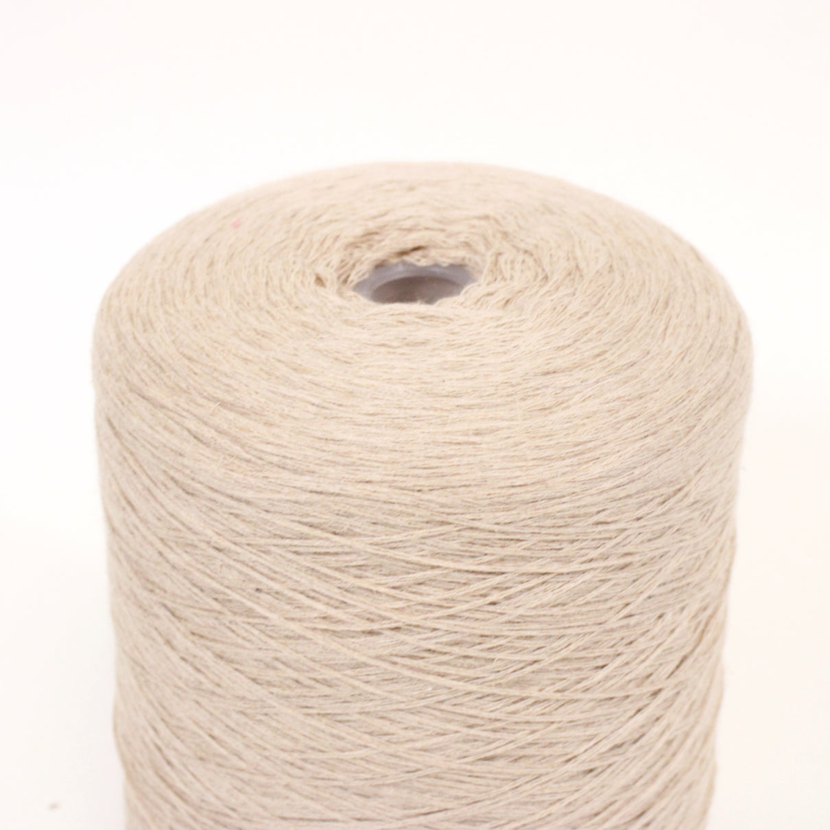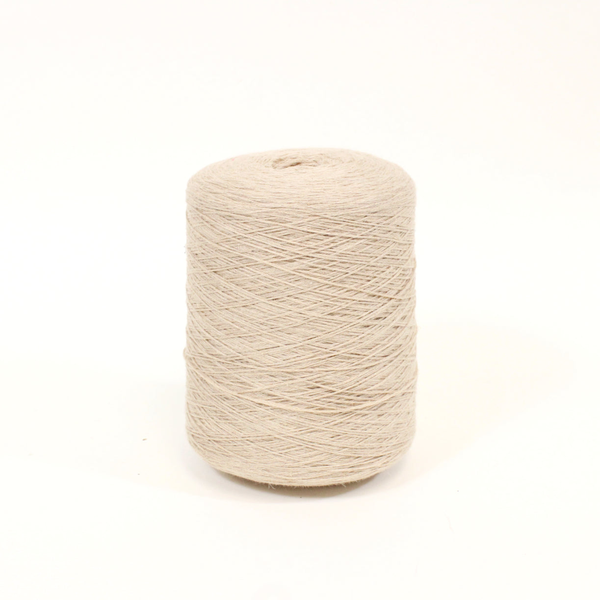 Fine-gauge yarn in a light oat color. Labeled 60% supima cotton, 40% organic hemp. Yarn size is labeled as 1/4.6NM, and the cone weighs 1.8lbs.