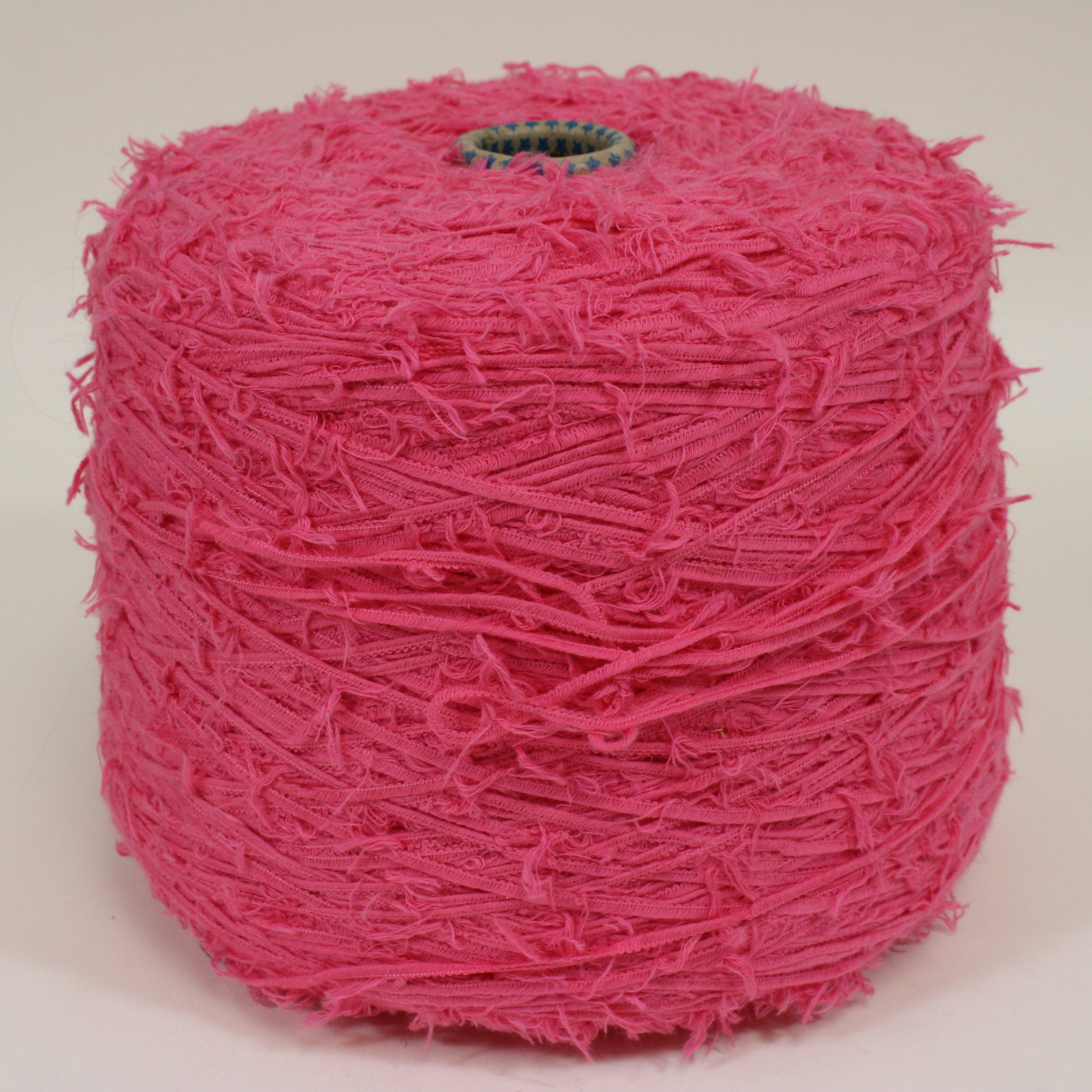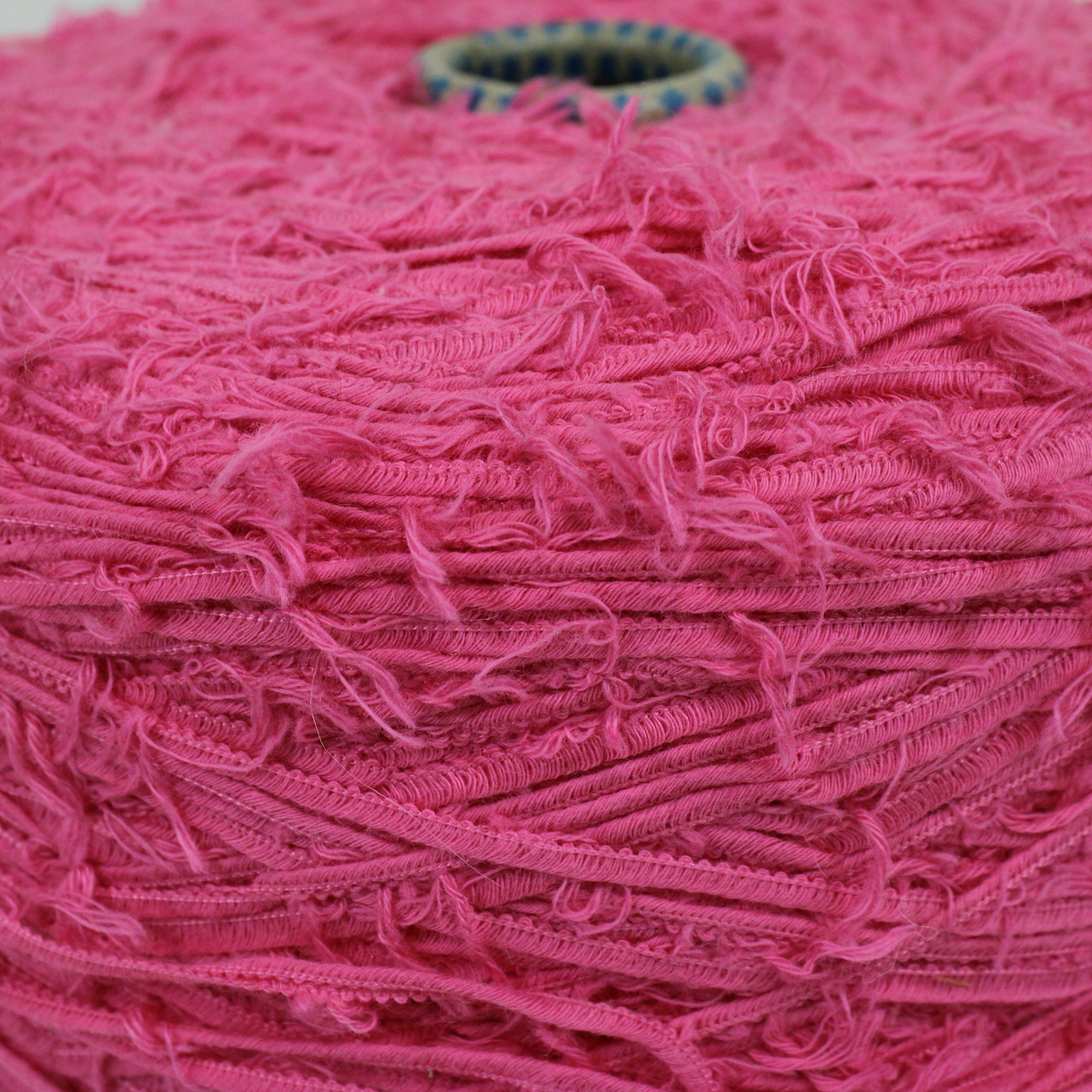 Lightweight yarn in hot pink. Labeled 80% cotton and 20% nylon. Labeled 1/1.7 NM. Cone weighs approximately 3 lbs.