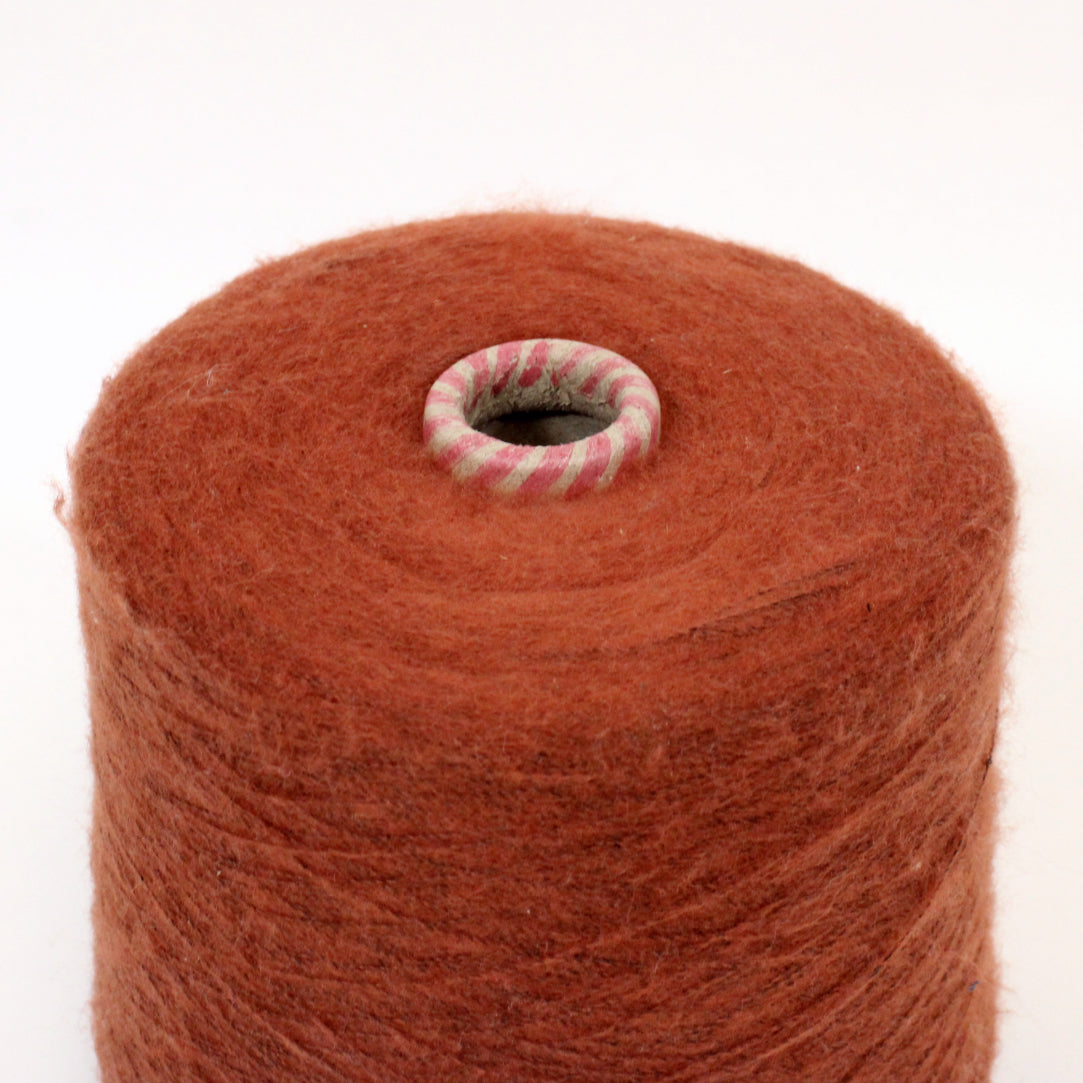 Very fine-gauge yarn in a redwood color, brushed to create a fuzzy texture. Labeled as 49% polyester, 30% acrylic, 13% nylon, and 5% wool content. Marked as 1/15NM gauge, and the cone weighs 2lb.