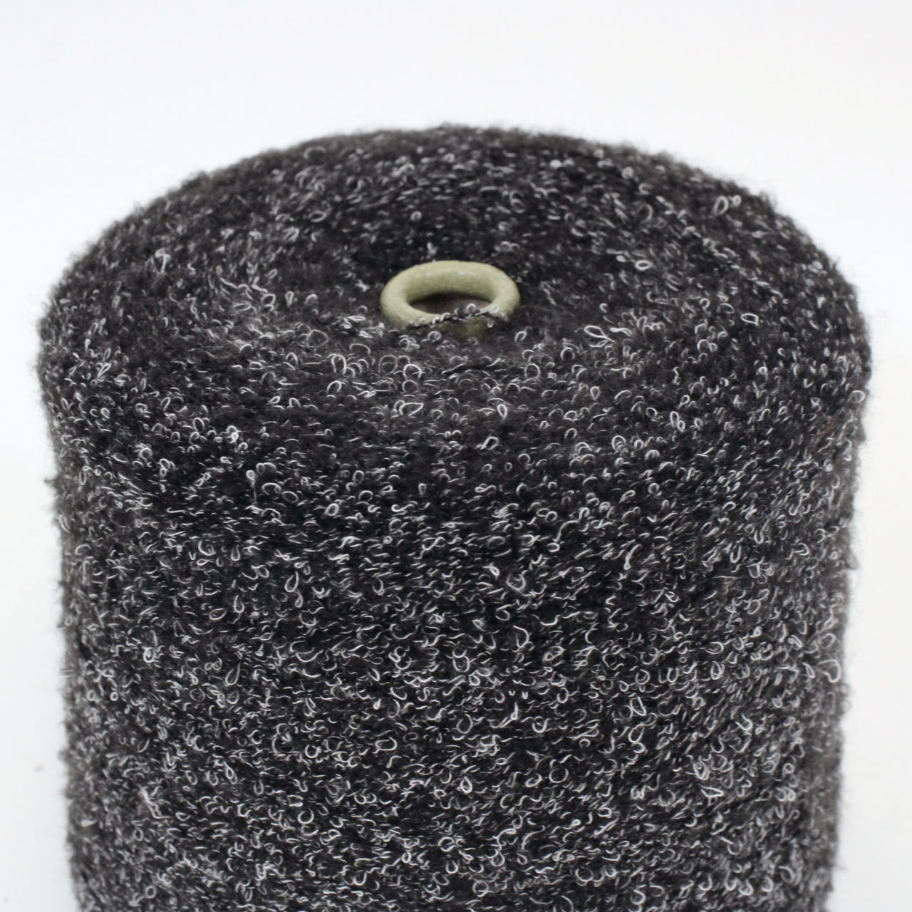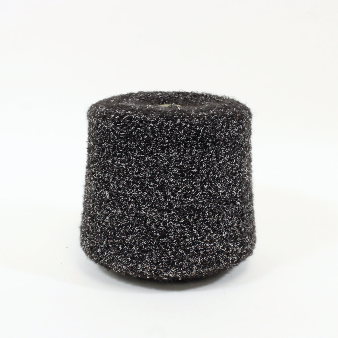 Lightweight, bouclé textured, black and white yarn. Labeled as 47% acrylic, 23% rayon, 21% polyester, 8% nylon, 1% spandex. Gauge labeled as 1/5NM. Available for purchase as a 2.8lb cone.