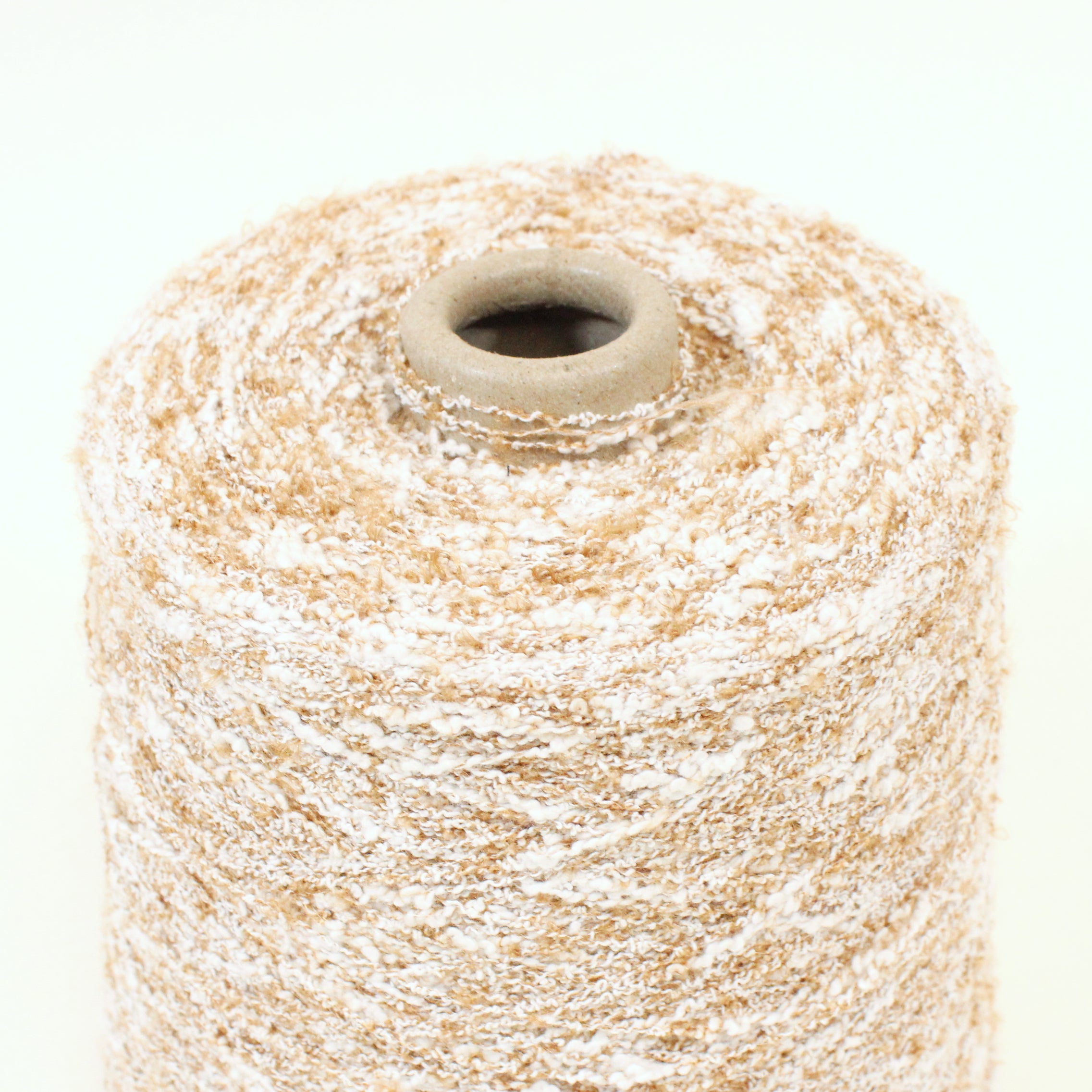 Lightweight yarn of curly sandy and white colored fibers. Fiber content is a blend. Cone weighs 2.0lbs.
