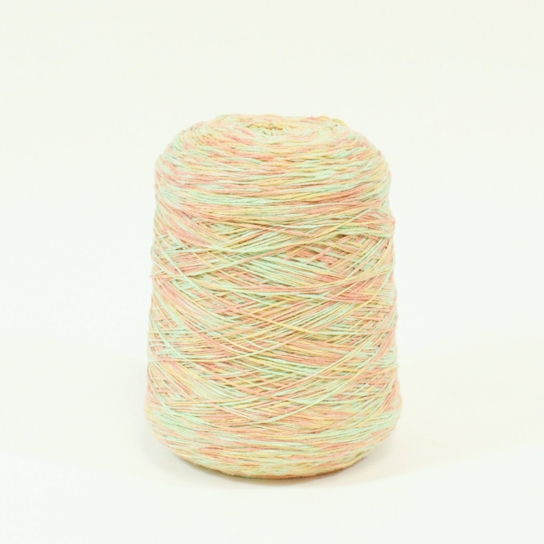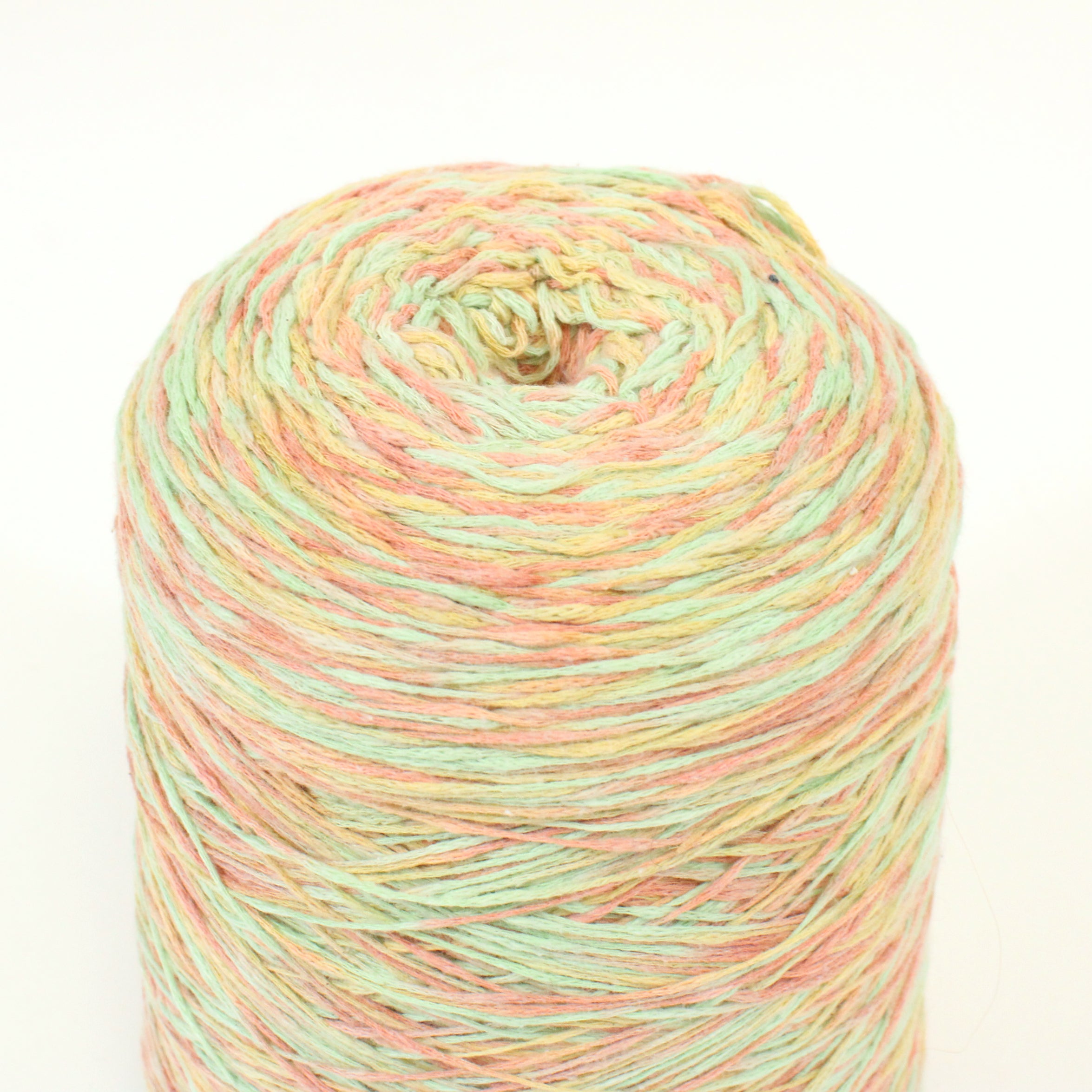 Midweight core yarn in sorbet multicolor pastels: green, yellow, peach. Fiber content is labeled as 55% cotton, 45% mixed synthetic. Cone weighs 1.8lbs.