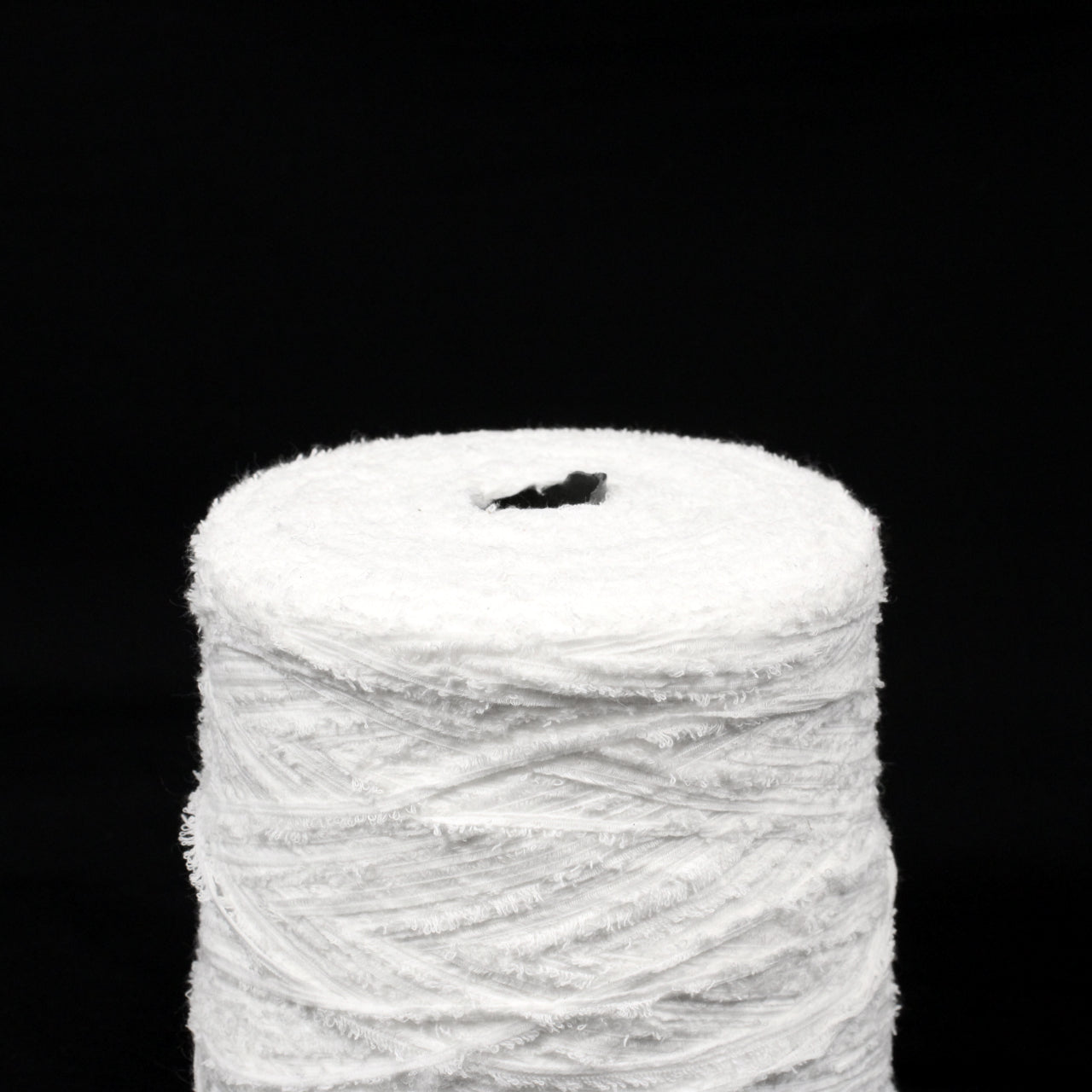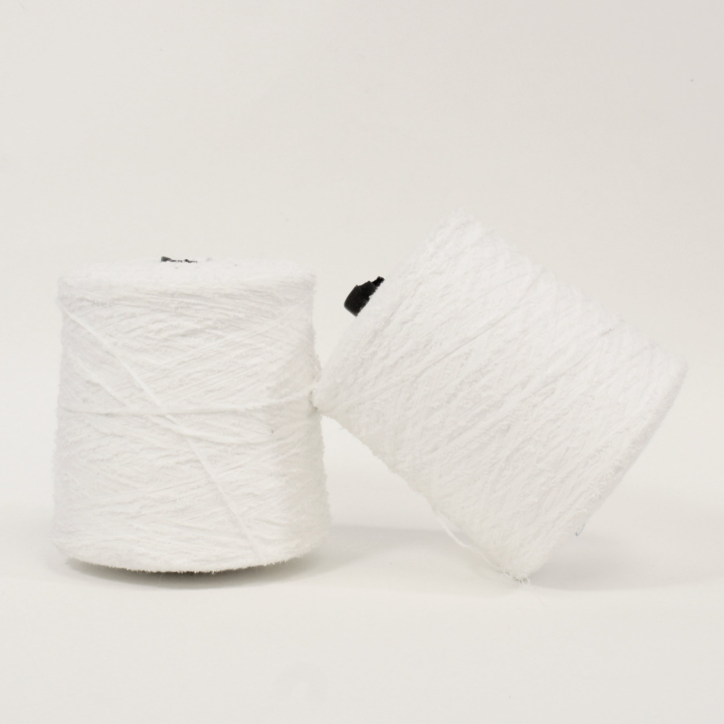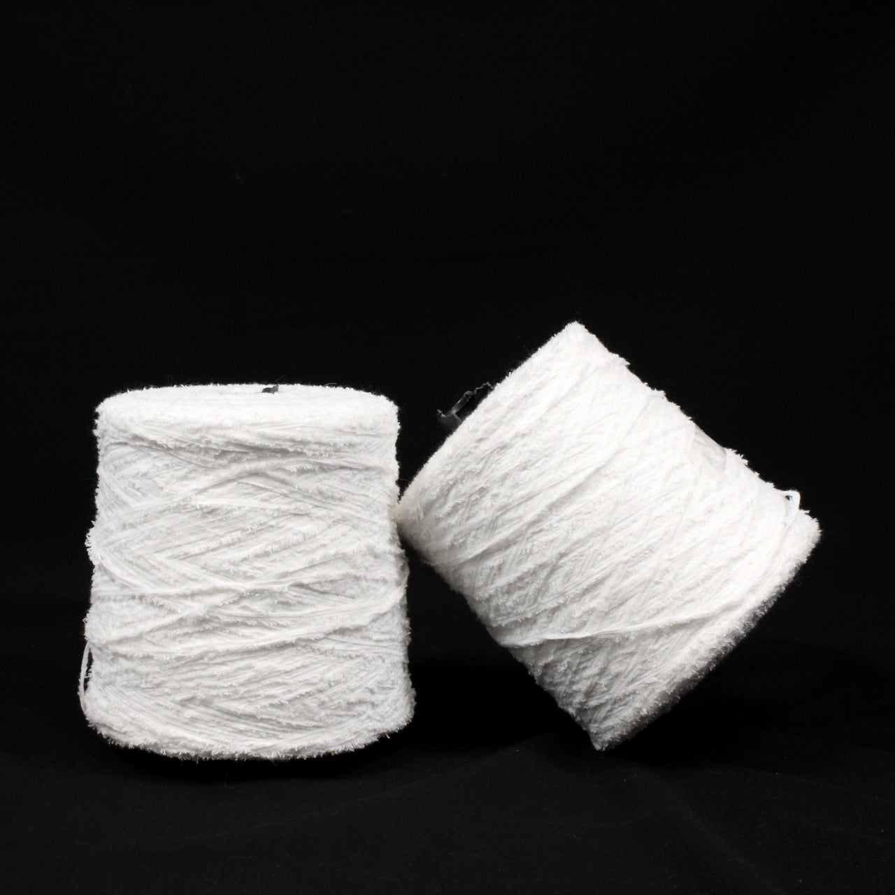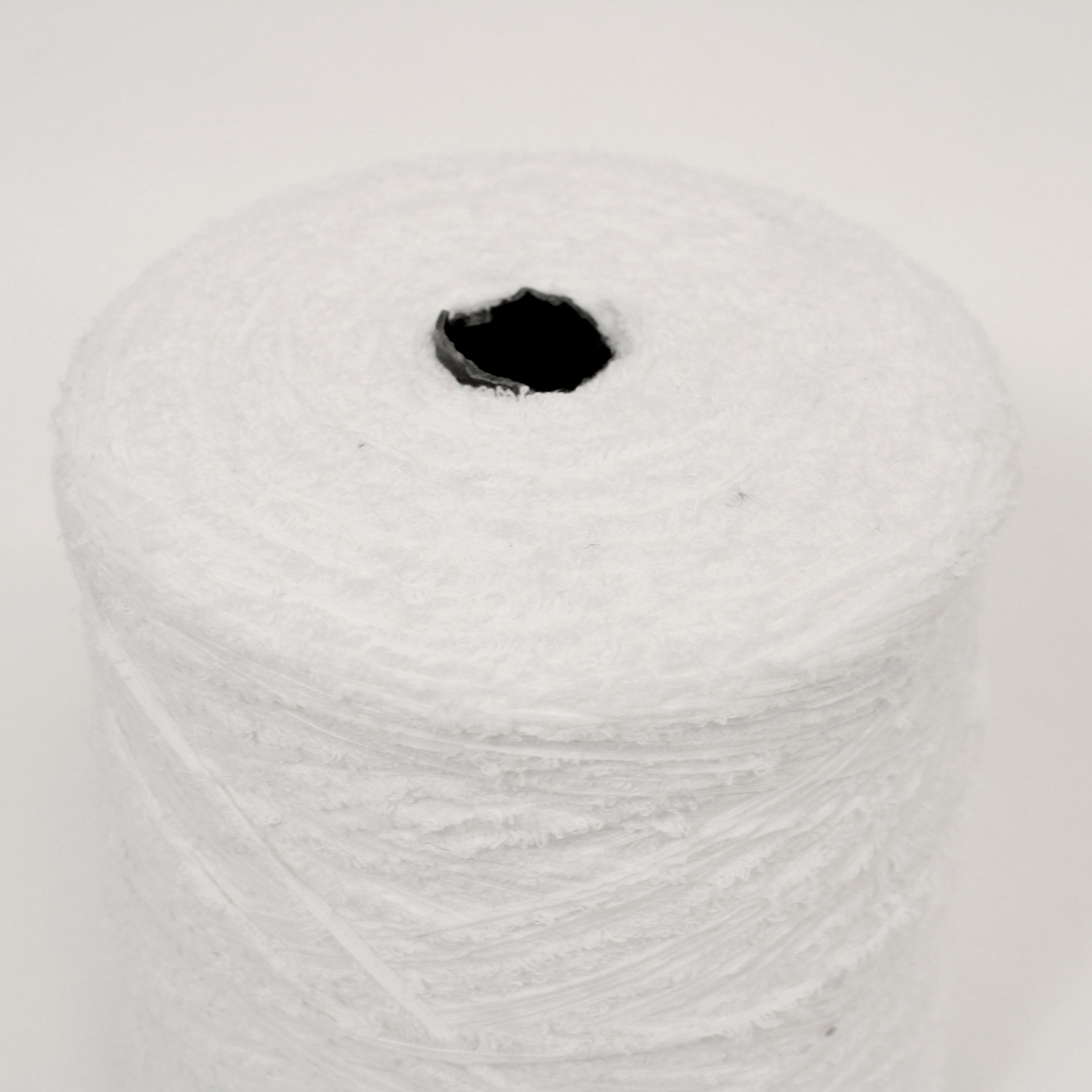 Eyelash yarn available in stark white. Labeled 80% cotton, 20% nylon. Marked as 1/2.2NM gauge. Available as a 2.3lb cone.